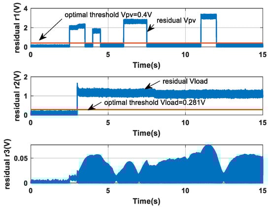 Examining the residuals in Figure 13 (proposed method) and Figure 14 (method from [28]) reveals a fundamental distinction in robustness. In Figure 14, the residual r3 exhibits significant deviations when a fault is injected into the PV voltage sensor and the load voltage sensor. This cross-sensitivity indicates that the method from [28] struggles to fully decouple simultaneous faults, which can lead to ambiguity in fault isolation. In contrast, the residuals generated by the proposed method (Figure 13) remain largely unaffected by faults on the non-corresponding sensor. This demonstrates the superior isolation capability of our adaptive SMO, which is a direct result of the optimized gains and the structured residual generation mechanism.