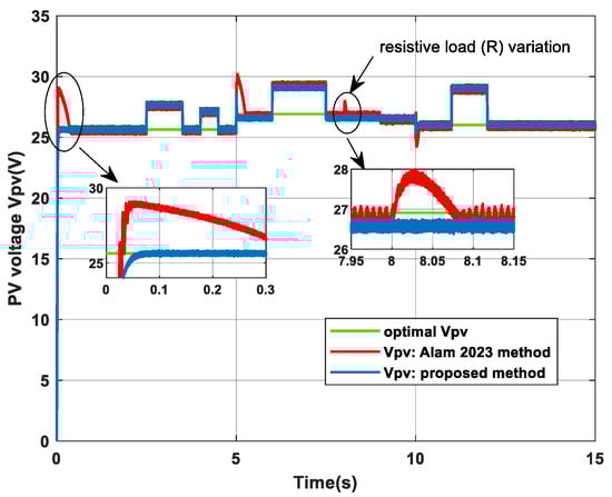 Furthermore, the transient performance illustrated in Figure 15 and Figure 16 underscores the advantage of the integrated control and diagnostic design. The proposed method exhibits a much faster recovery and tighter tracking of the optimal power point and PV voltage reference following disturbances, such as the step change in irradiance at t = 5 s and the resistive load variation. The method from [28] shows more pronounced oscillations and a longer settling time.