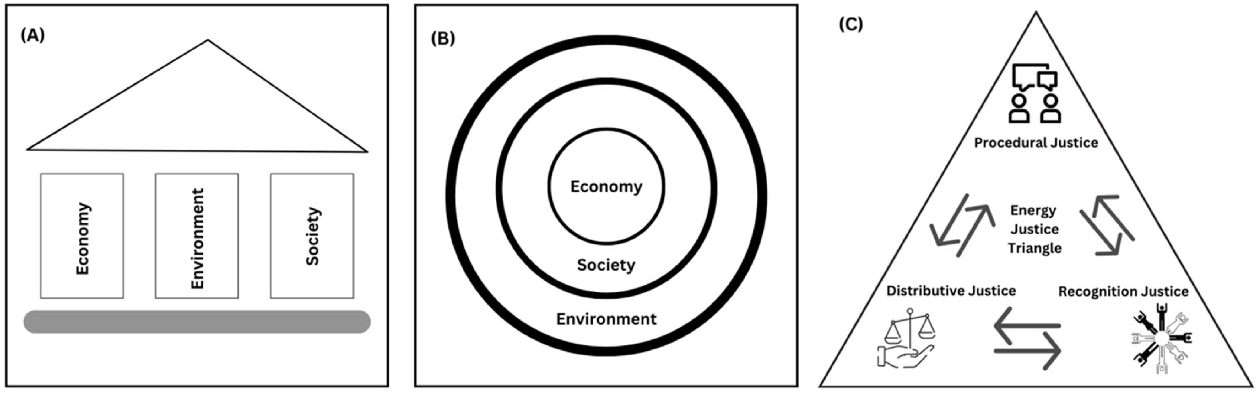 Figure 1. Conceptual model demonstrating interconnection. Panel (A) depicts the dominant “three pillars model of sustainability”, which treats economic, environmental, and social dimensions as separate [43]. Panel (B) shows the ecologically centred, nested model of sustainability, where socioeconomic dimensions are dependent on the environmental foundation. Panel (C) applies this logic to advance an interconnected energy justice model, where, for example, procedural and recognition failures can precede and reinforce distributive injustices.