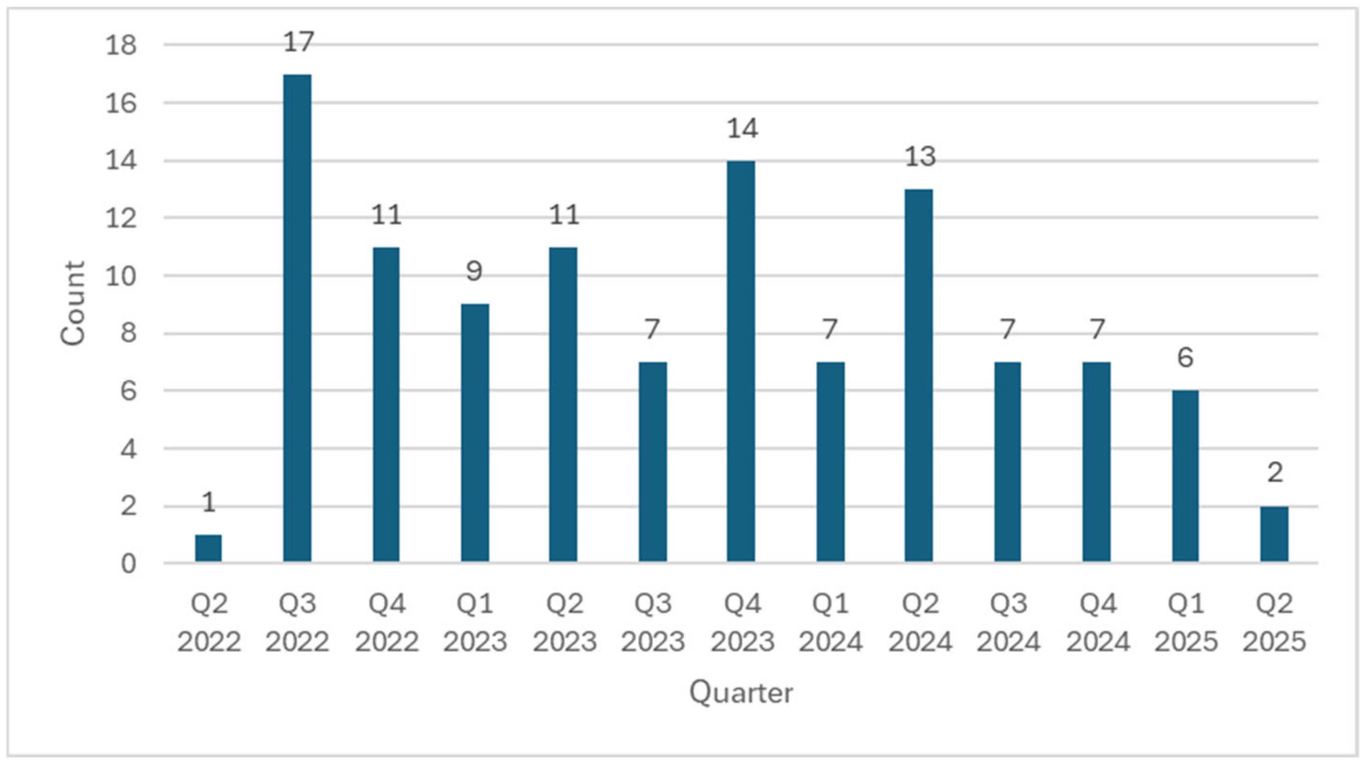 Media coverage of the six W2H projects has varied widely over time, ranging from one publication during Q2, 2022, to 17 publications during Q3, 2022 (Figure 2). The average across 13 quarters in the dataset was approximately 8.6 publications per quarter, with five quarters above average. Table 3 identifies the above-average quarters and summarizes some key events leading to peaks in media coverage.