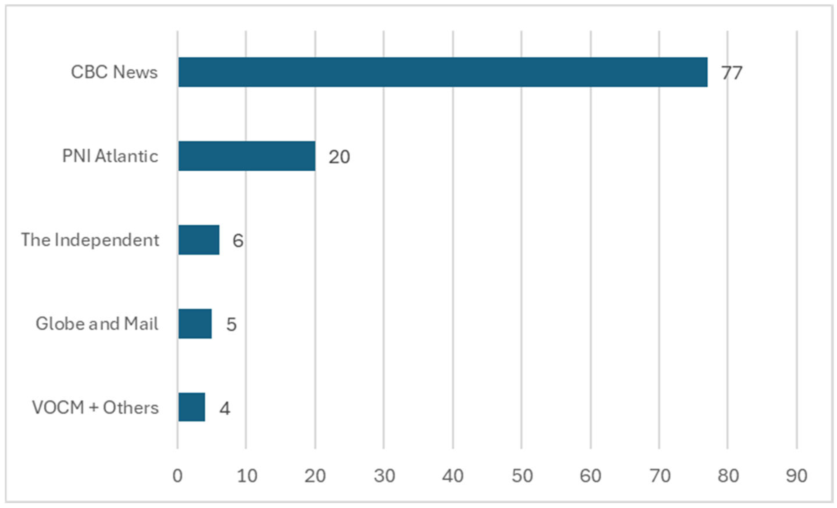 As demonstrated in Figure 3, the media review found articles published by seven unique outlets (The Category “VOCM + Others” includes two publications by ‘VOCM’, one by ‘Corporate Knights’, and one by ‘BNN Bloomberg’). CBC, Canada’s national public broadcaster, accounts for a large majority of the dataset, or approximately 69 per cent of the records. CBC maintains close to 50 stations and bureaus across Canada, with several spread across Newfoundland and Labrador’s vast geography. There are four bureaus on the island portion of the province, including Corner Brook, Grand Falls-Windsor, Gander, and St. John’s [165], meaning that there is a CBC bureau within close proximity to many of the proposed W2H sites. The findings suggest an important role for public broadcasters (such as CBC) in reporting on energy justice dynamics in sparsely populated rural and island regions, where a business case may not exist for the private sector. Combined, a multitude of private outlets, including PNI Atlantic, the Globe and Mail, VOCM, BNN Bloomberg, and Corporate Knights, account for 26% of the records. Postmedia is the parent company of PNI Atlantic News, a conglomeration of Atlantic Canadian news resources including the St. John’s Telegram in Newfoundland [166] (It is noted that Postmedia purchased ‘SaltWire Network Inc.’, a collection of 23 daily and weekly newspapers in Atlantic Canada and rebranded as ‘PNI Atlantic News’ in July of 2024, which is during the time period covered in this study.). The Independent, which alone accounts for five per cent of the records, is a not-for-profit media collective. The news source is unique in the study as it does not rely on corporate funding, unlike other media outlets that depend on it [167].