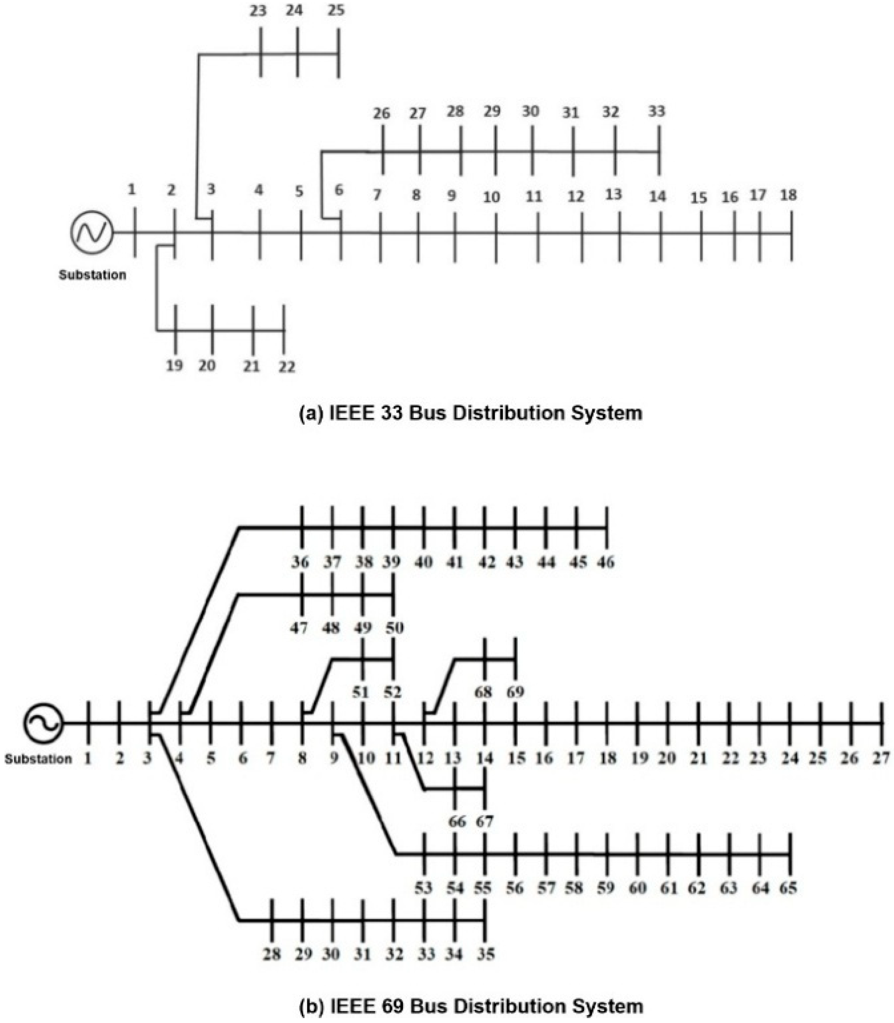 - In the first step, data regarding IEEE bus systems is uploaded from MATPOWER version 8.0 onto the MATLAB program. IEEE 33 and 69 distribution systems are represented in Figure 1.