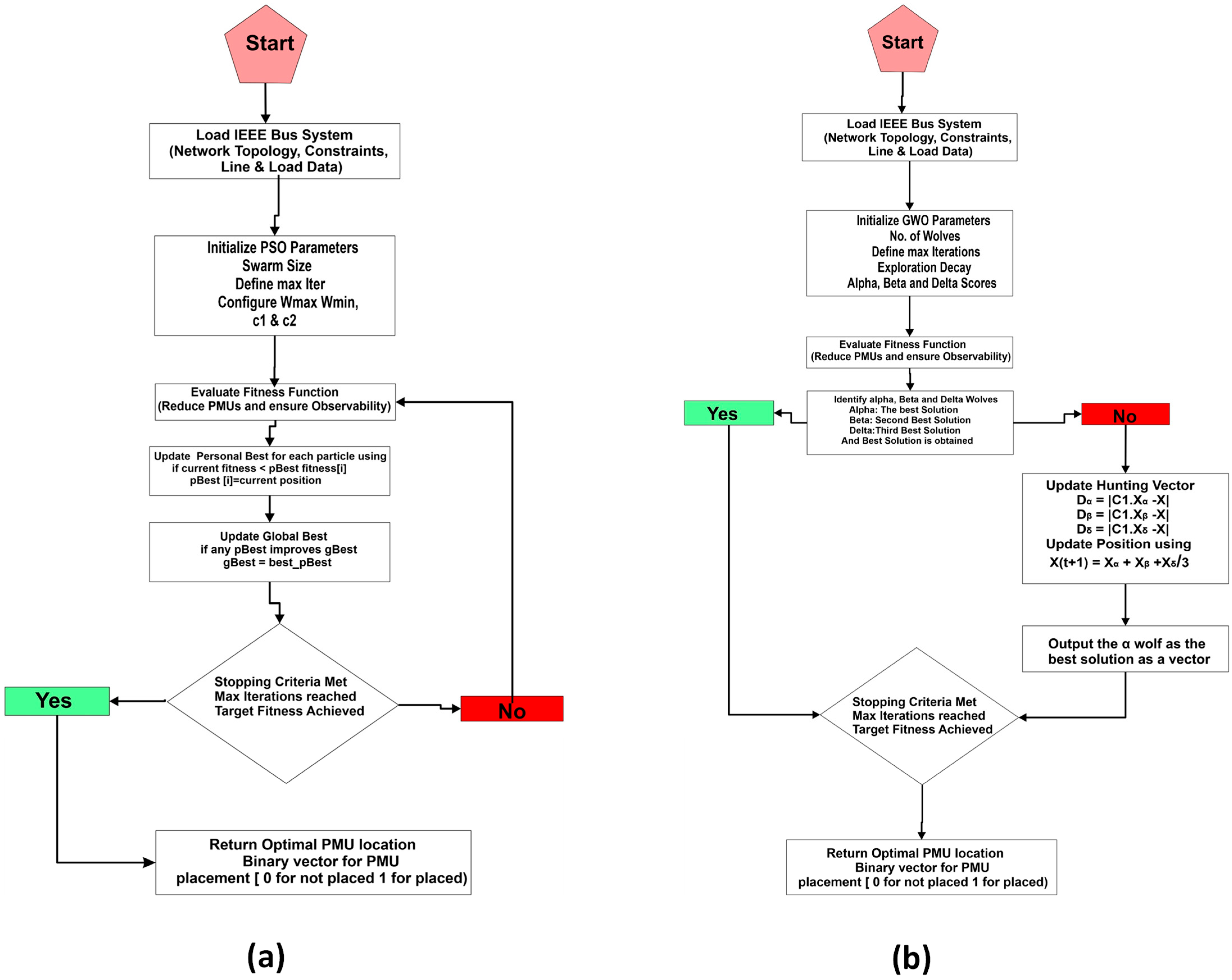 - Simulations are performed, and as the fitness criteria are achieved, the program stops and generates a binary vector consisting of 0’s and 1’s indicating on which buses PMUs are installed. The flowcharts for both PSO and GWO are shown in Figure 2.