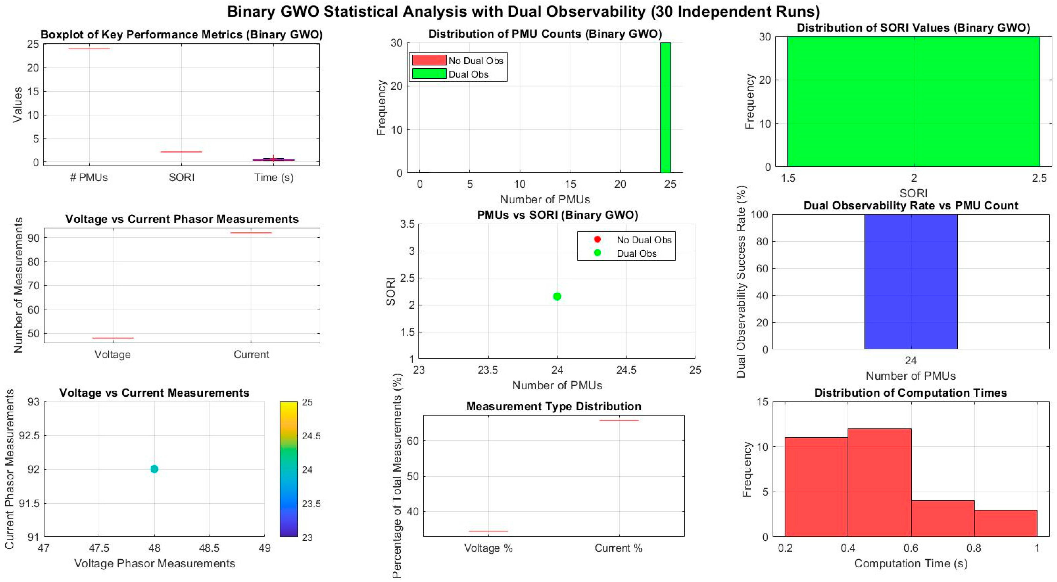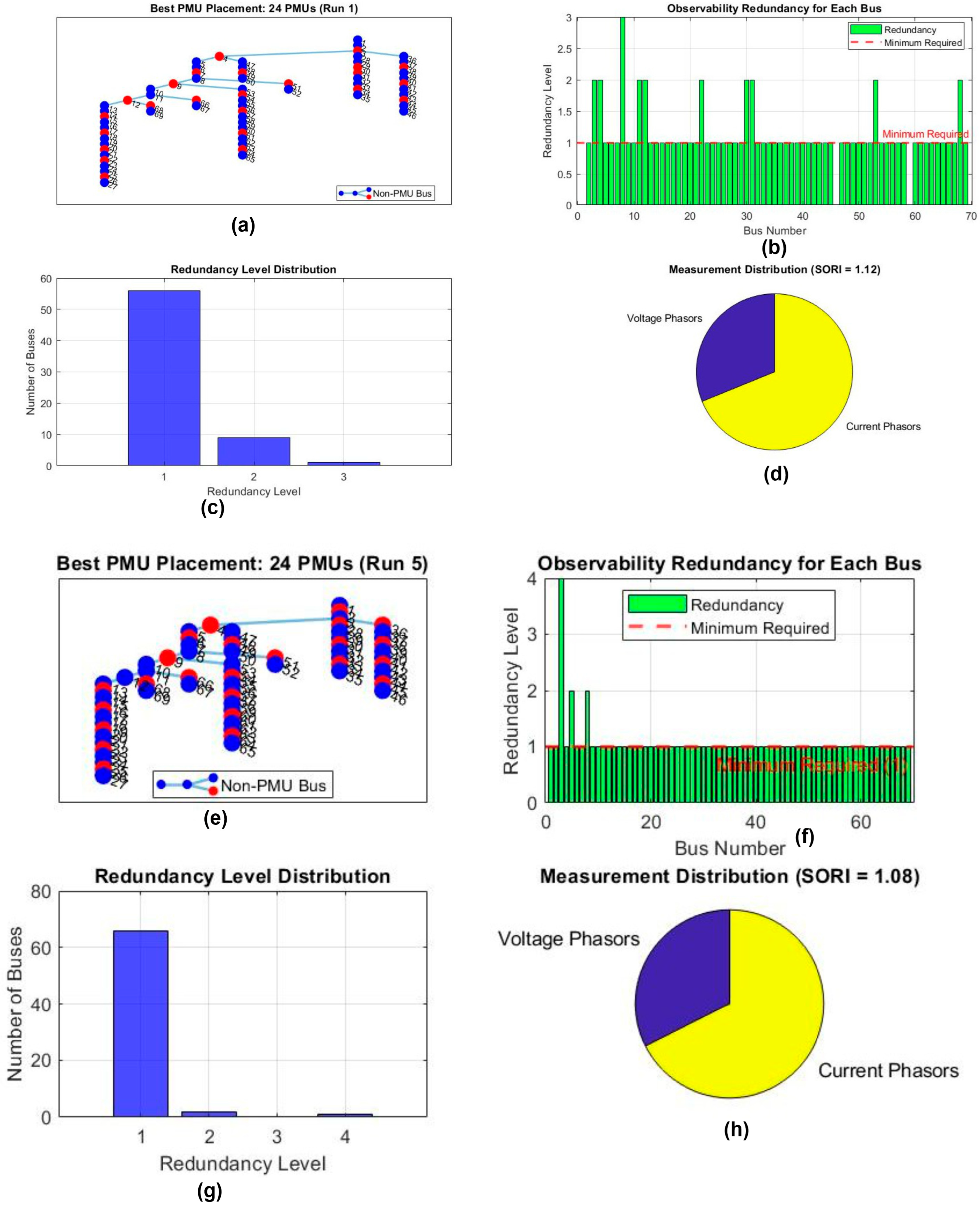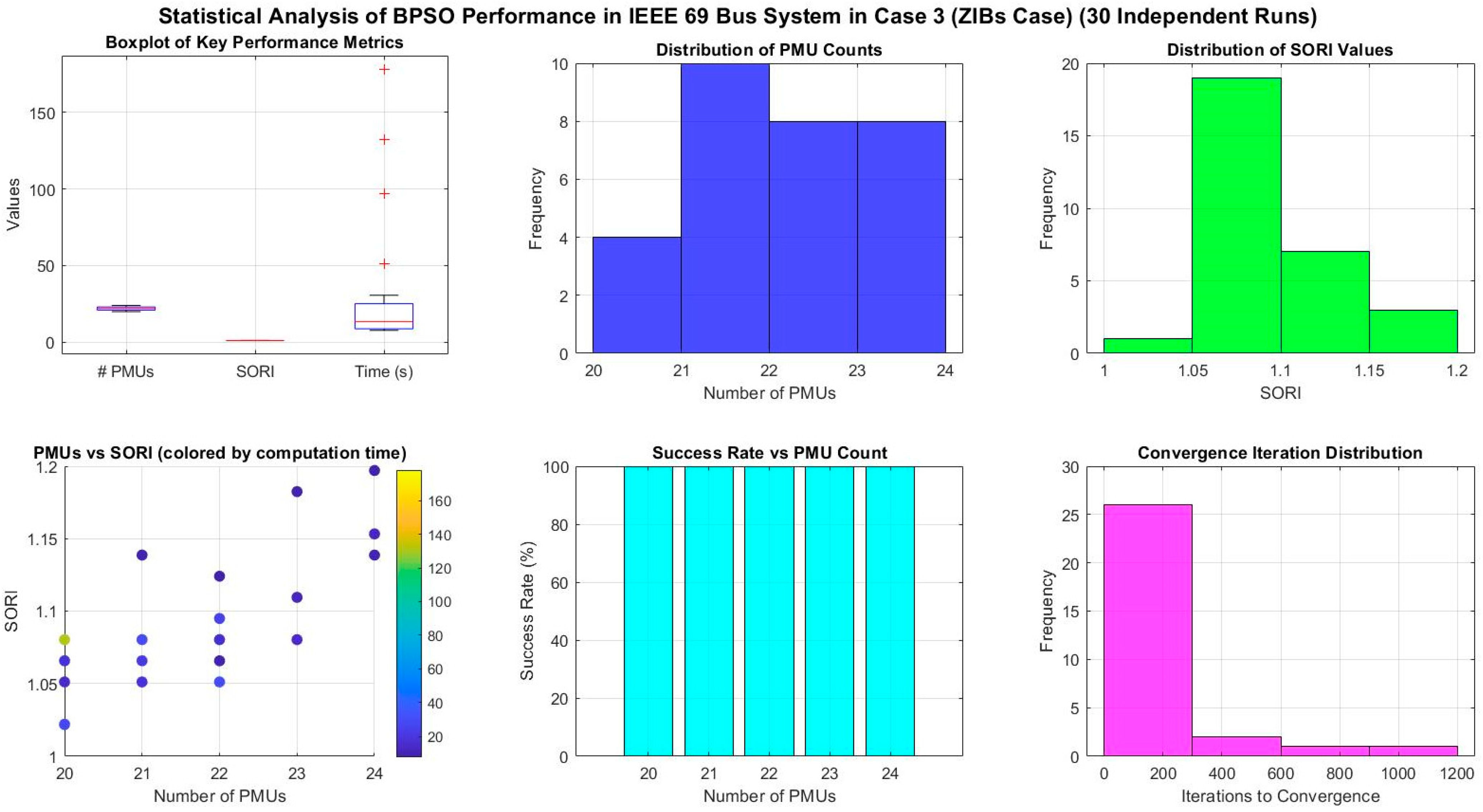- A detailed statistical analysis is performed to determine the robustness of proposed algorithms, and a pareto front analysis between SORI and number of PMUs is performed to determine the impact of PMU count on system observability.