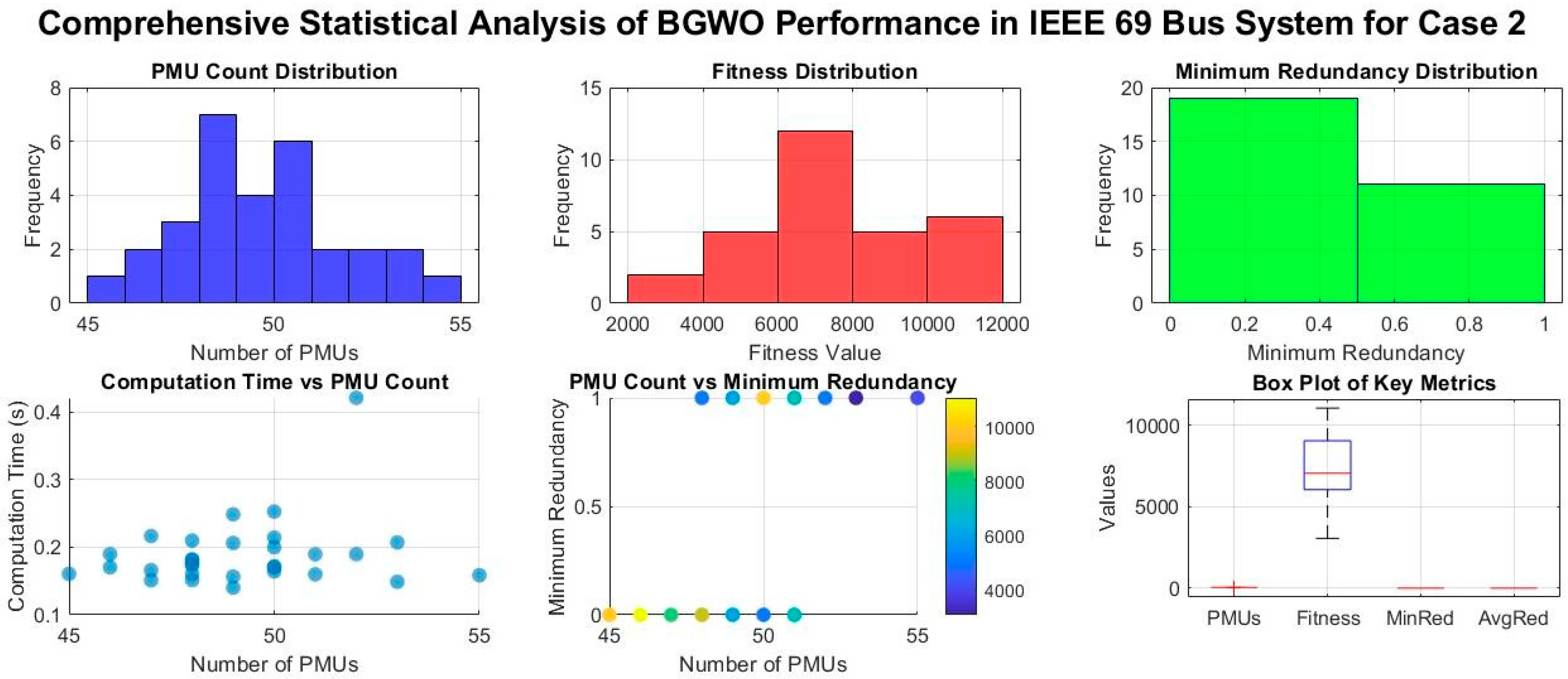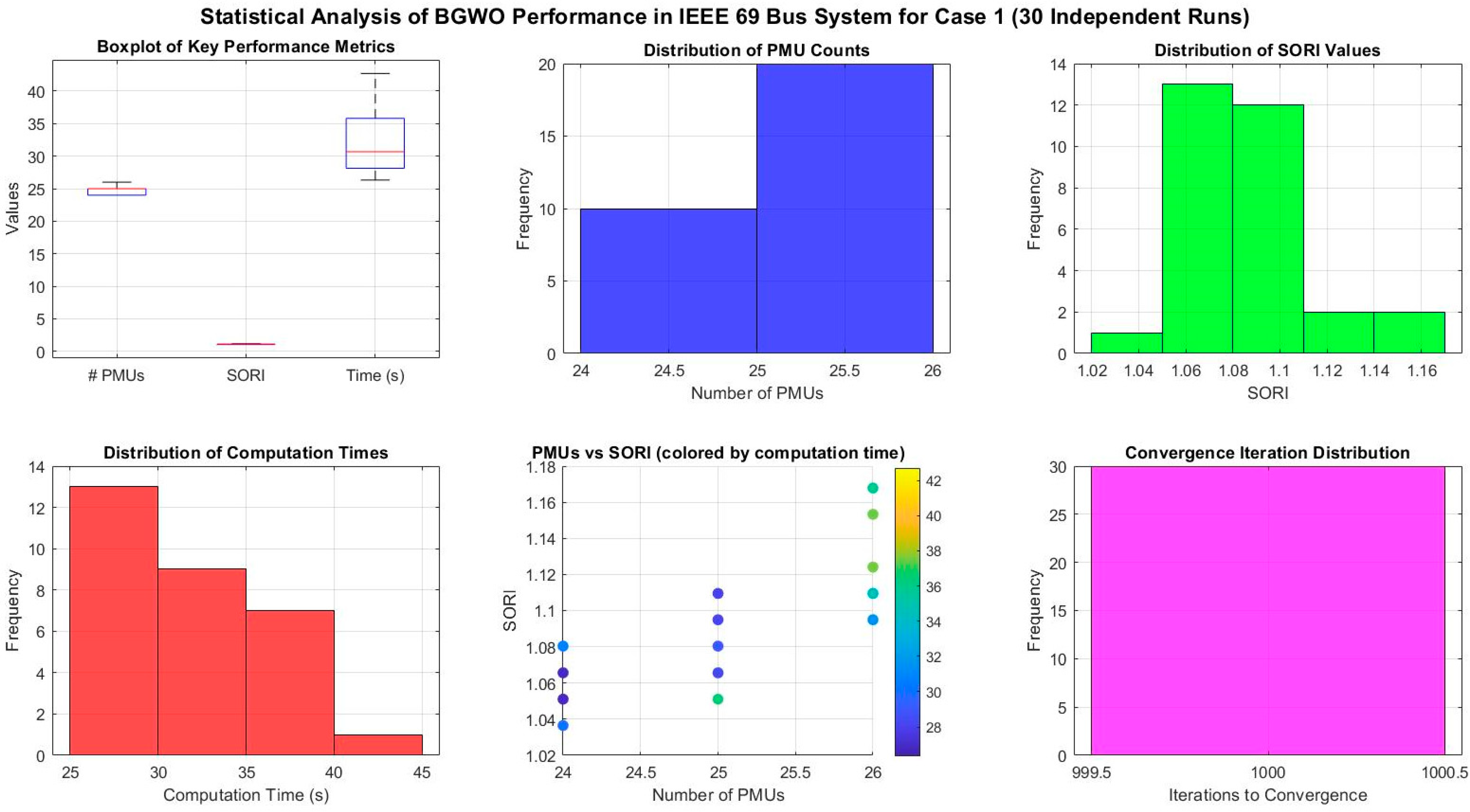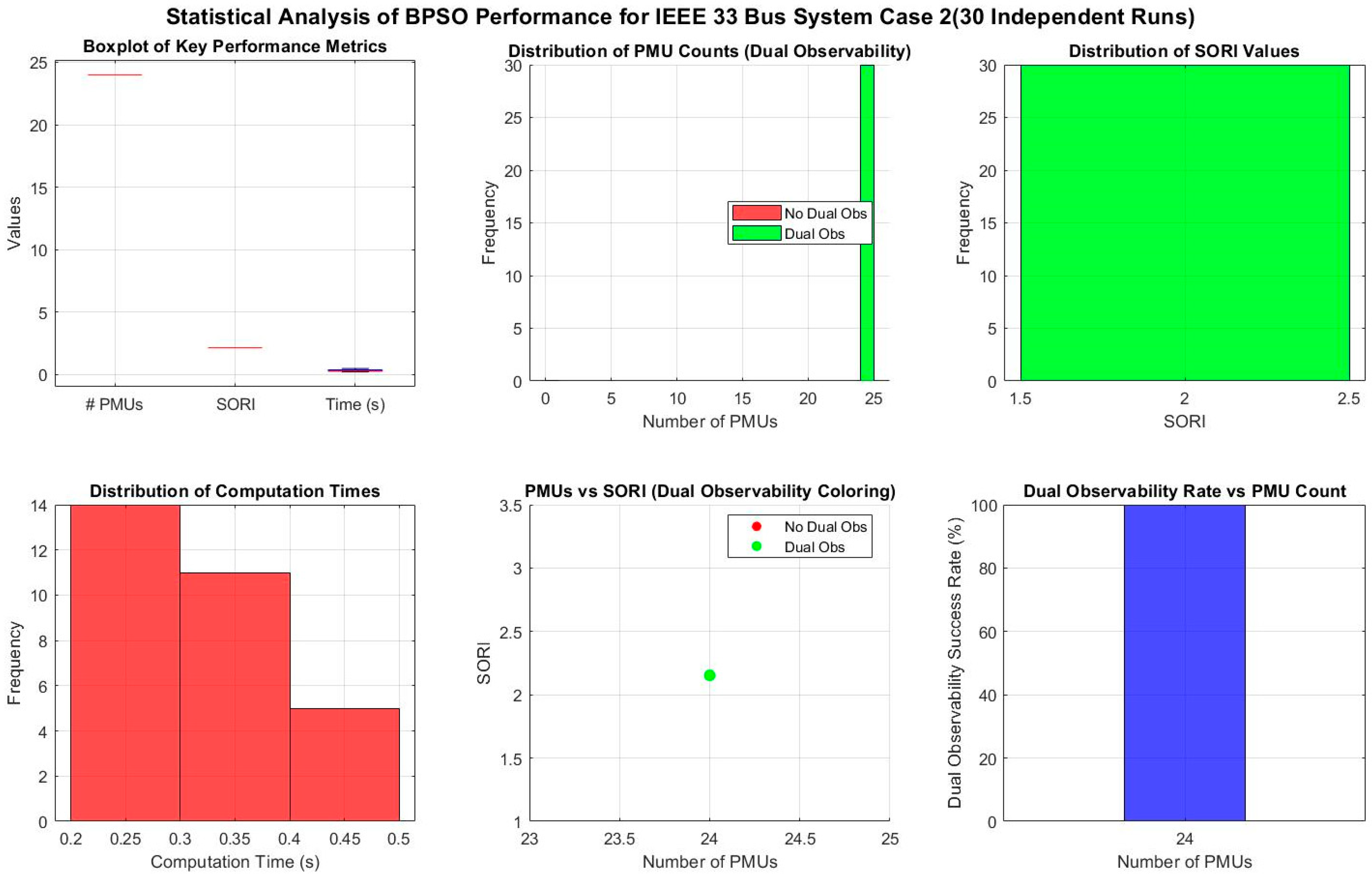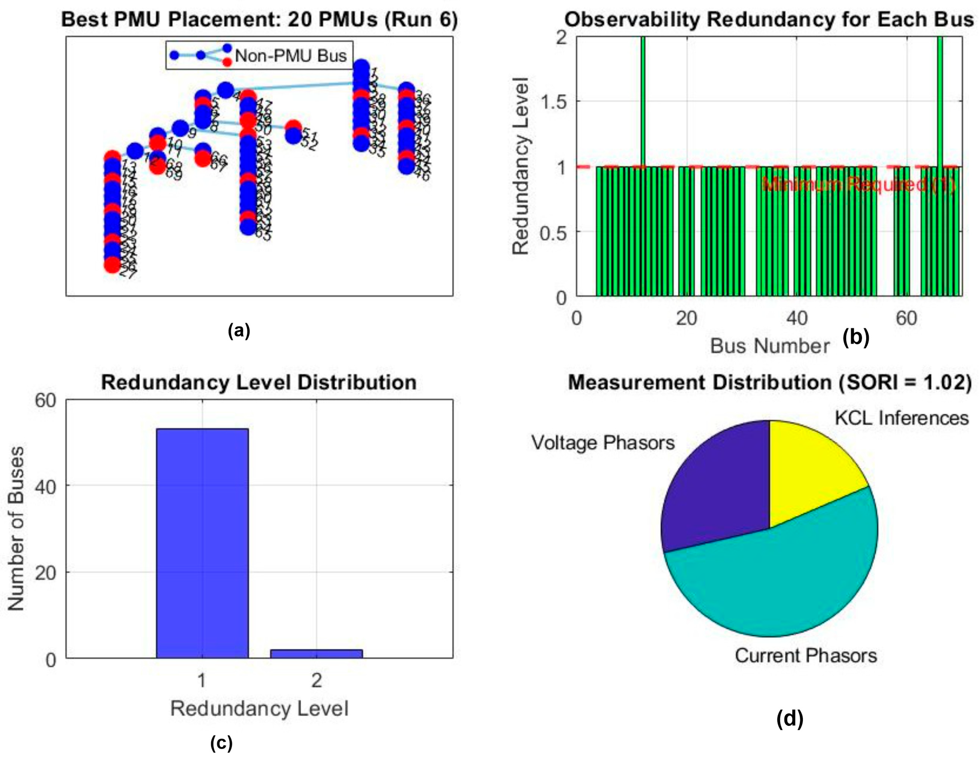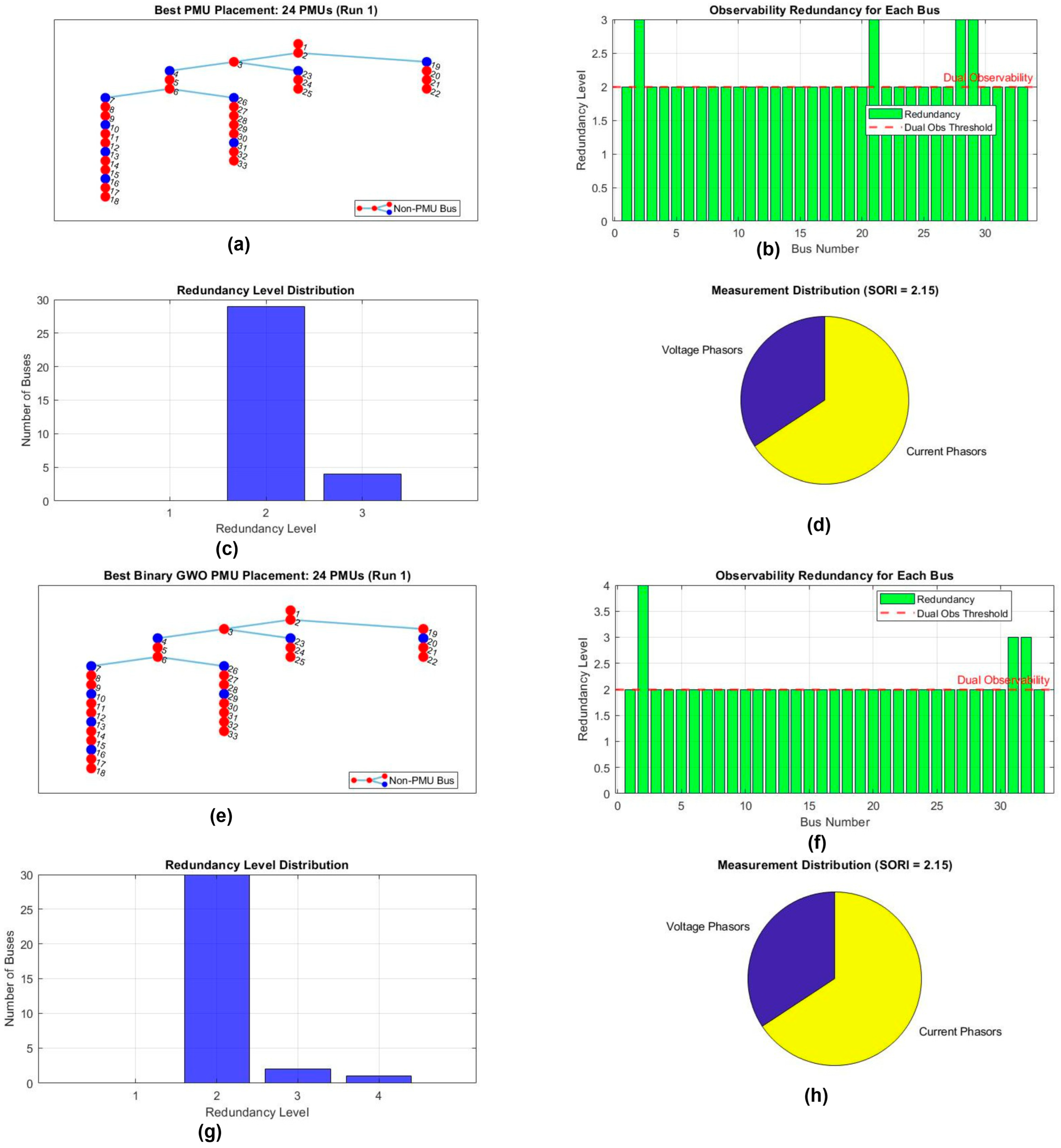 - After the formation of the connectivity matrix, initial parameters for both algorithms are initialized, and the fitness function is defined. The main objective of the fitness function is to reduce the number of PMUs while ensuring full observability for all cases. Three case studies are performed for both the 33 and 69 bus systems, i.e., under normal conditions, with Zero Injection buses, and a single PMU outage. ZIBs are identified to leverage them to reduce the PMUs for network observability.