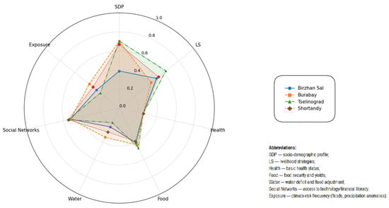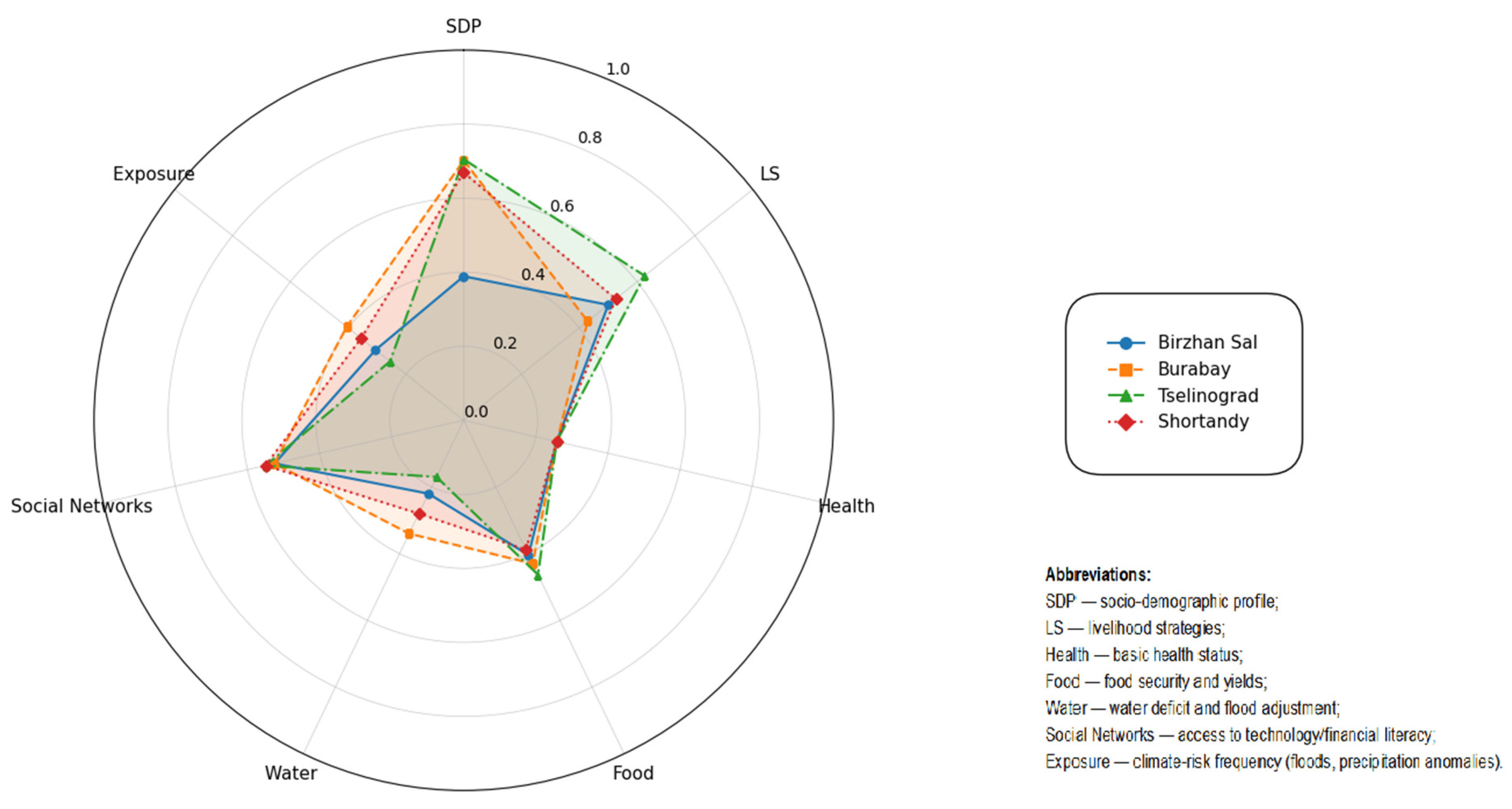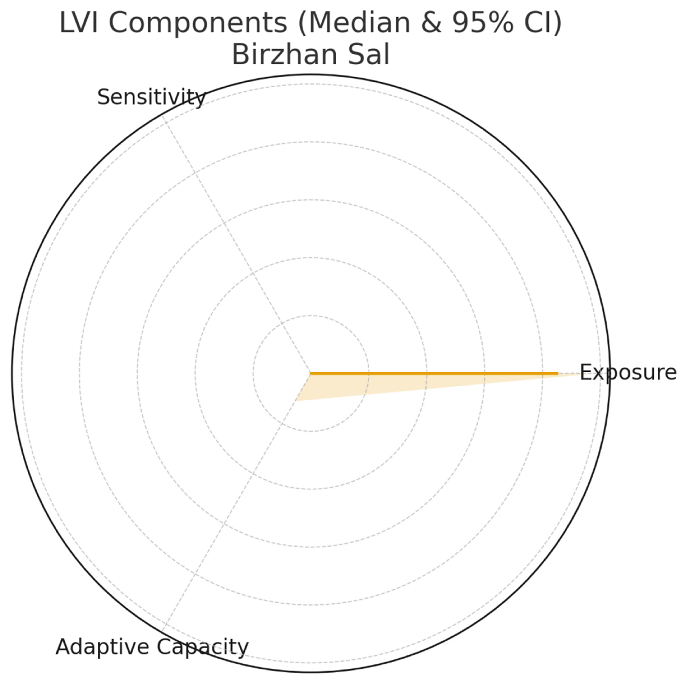 - Baytelieva, A.; Lee, W.-K.; Wang, S.W.; Iskakova, A.; Ziyayeva, G.; Shilibek, K.; Azatov, N.; Zholamanov, N.; Minarbekov, Z. Assessing the Vulnerability of Nomadic Pastoralists’ Livelihoods to Climate Change in the Zhetysu Region of Kazakhstan. Land 2023, 12, 2038. [Google Scholar] [CrossRef]