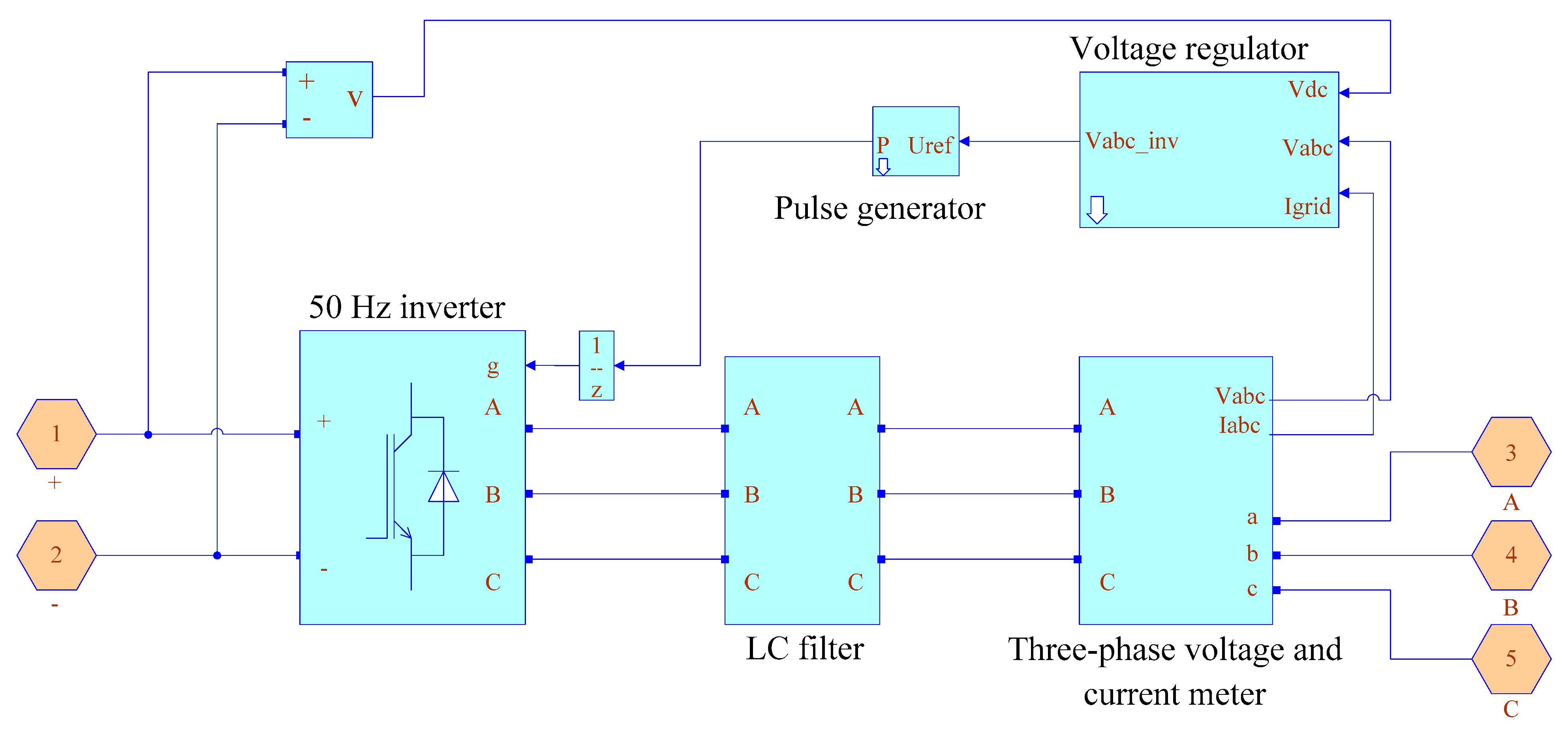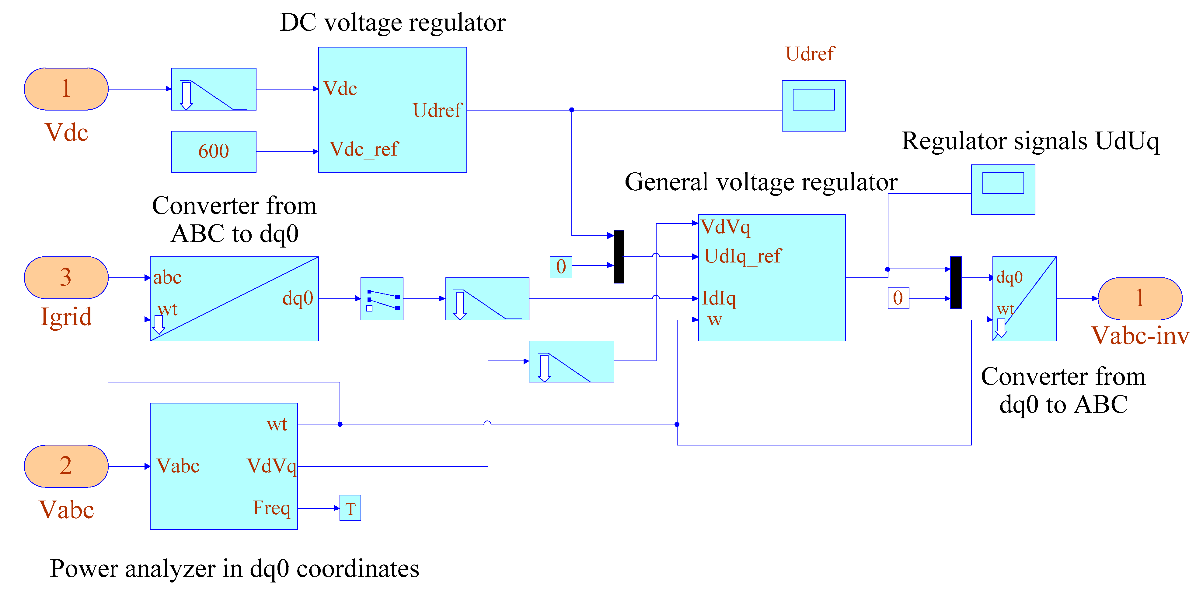 - A modified model of the voltage regulator of the energy router inverter is developed. An algorithm for stabilizing the DC and AC voltage is proposed, relying on the transformation of three-phase coordinates a–b–c into the system d–q–0. The diagrams and description of the models for the power system based on the energy router with a DC charging station and a DC/DC converter to control the mode of electric vehicle batteries are presented.