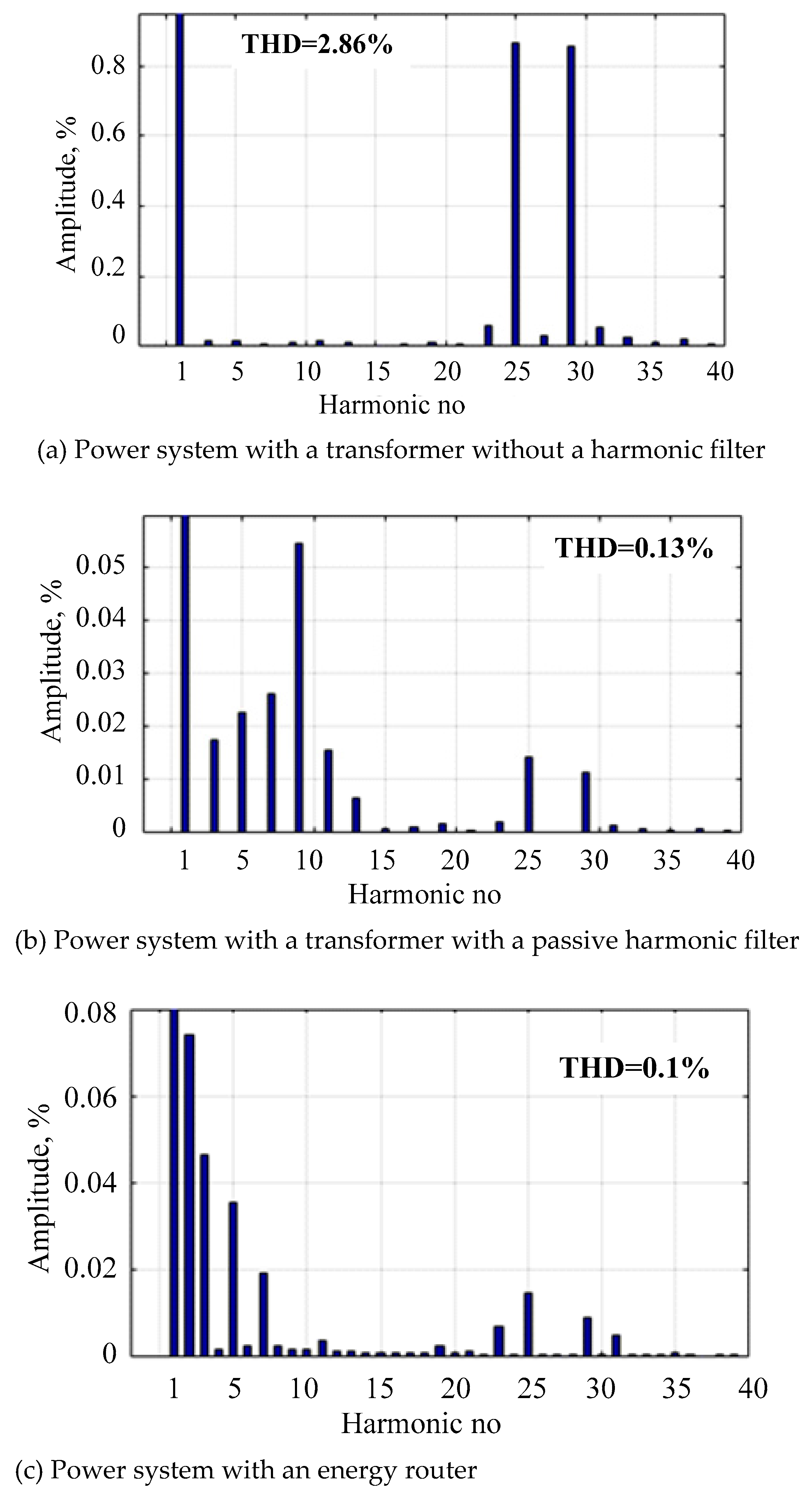 - Simulation modeling was performed for a power system incorporating an electric vehicle charging station. Connecting the charging station through a standard transformer and a bidirectional AC/DC converter produces noticeable harmonic voltage distortions (the THD kU is 2.9%). Installing a passive filter can reduce kU to 0.13%. The use of an energy router in a power supply system significantly reduces the amplitudes of the generated harmonics at the 0.4 kV consumer buses: the THD kU in a steady state declines by 29 times from 2.9 to 0.1%. Complete suppression of high-harmonics can be achieved using active filters with an appropriate control algorithm.