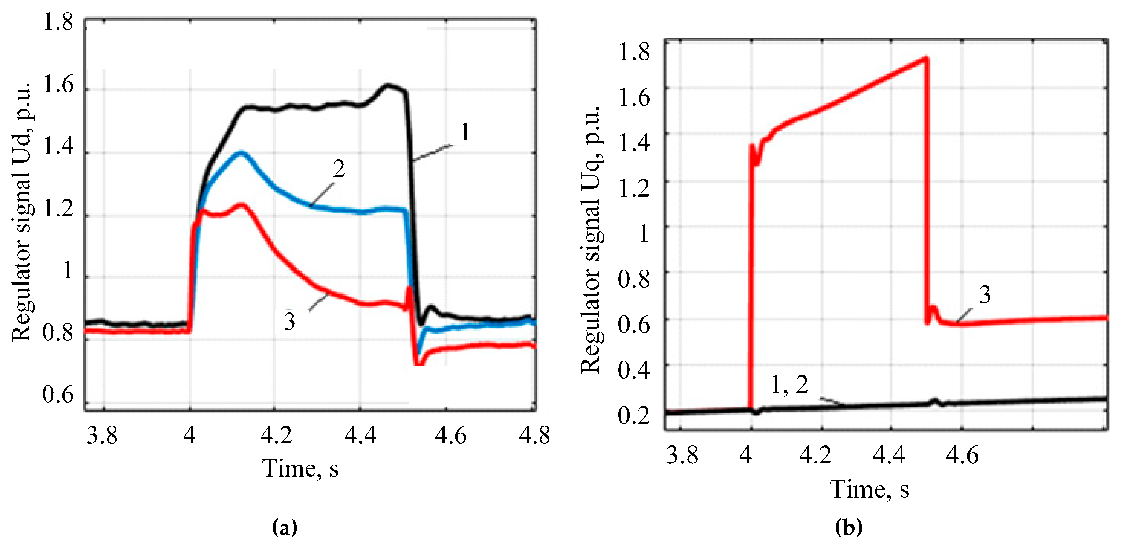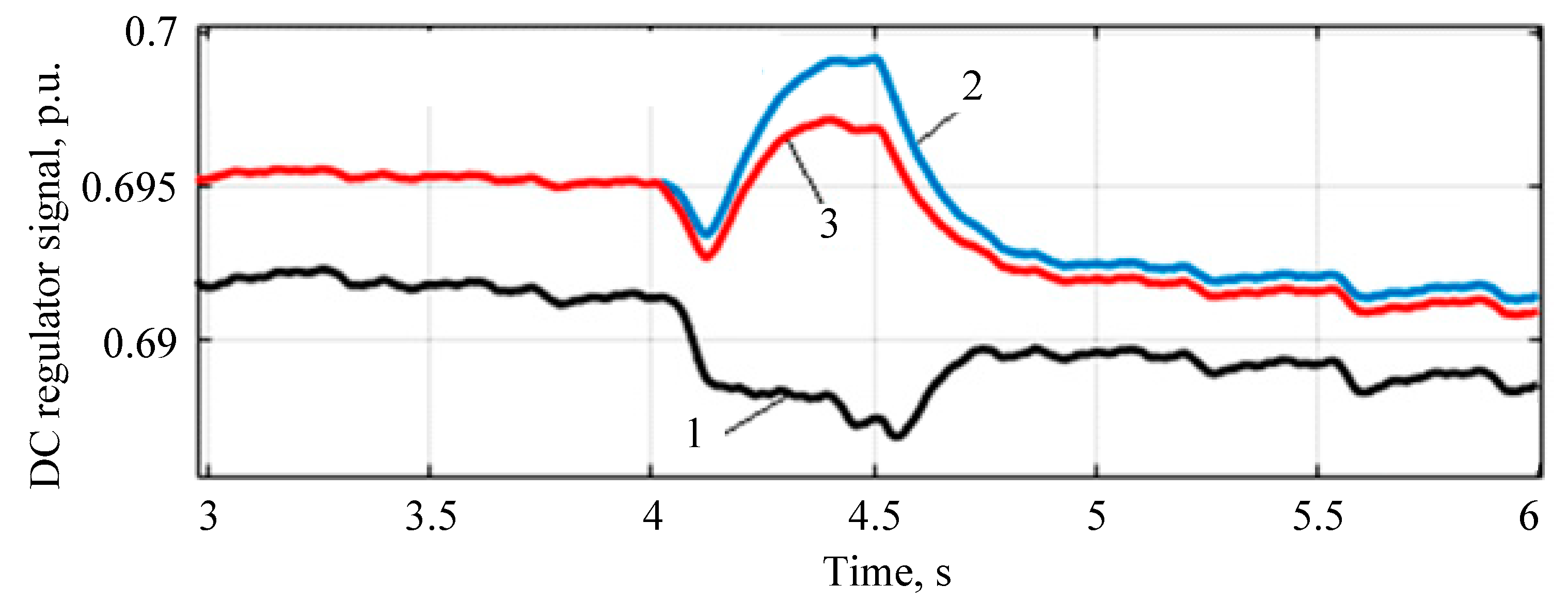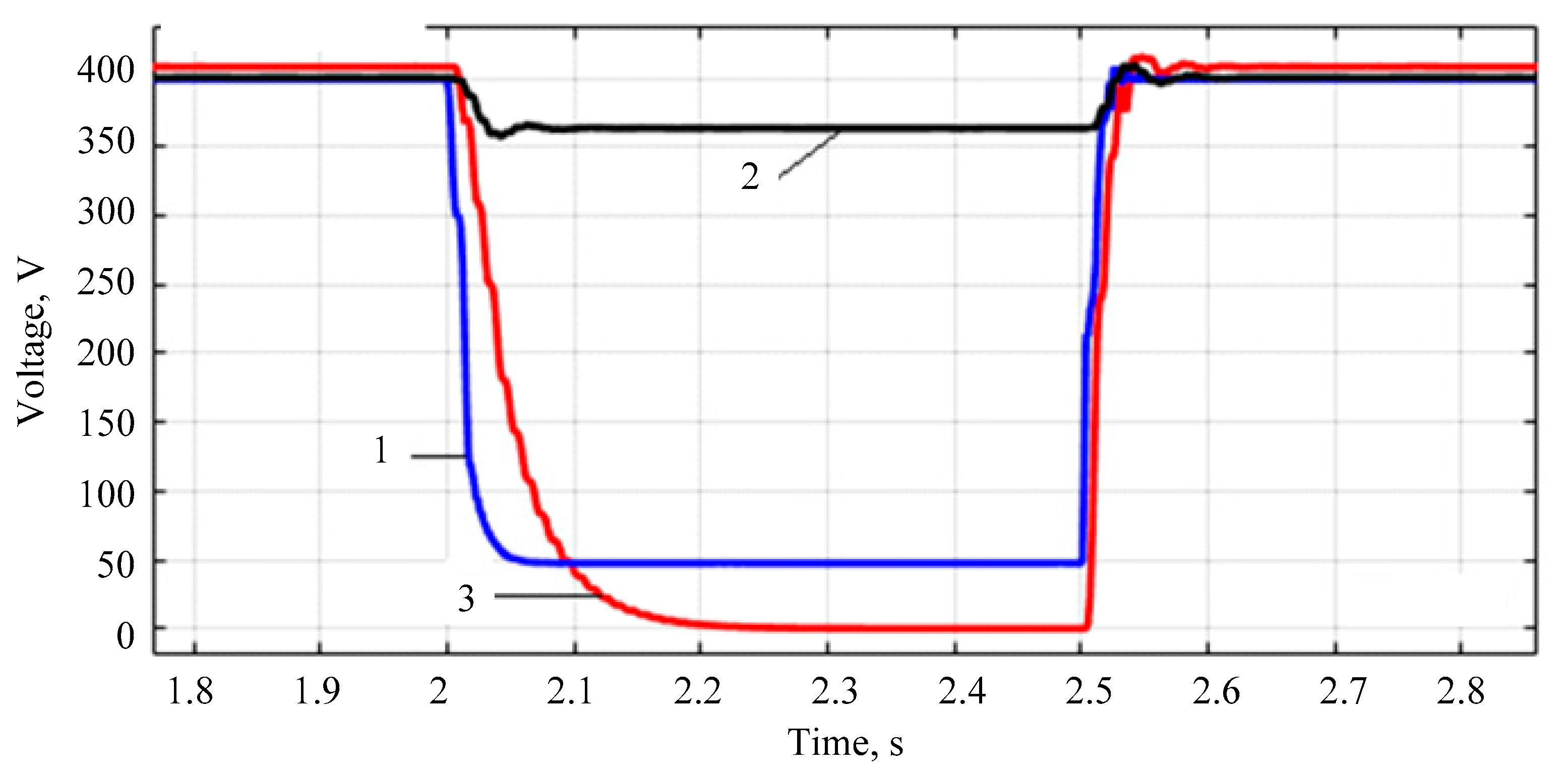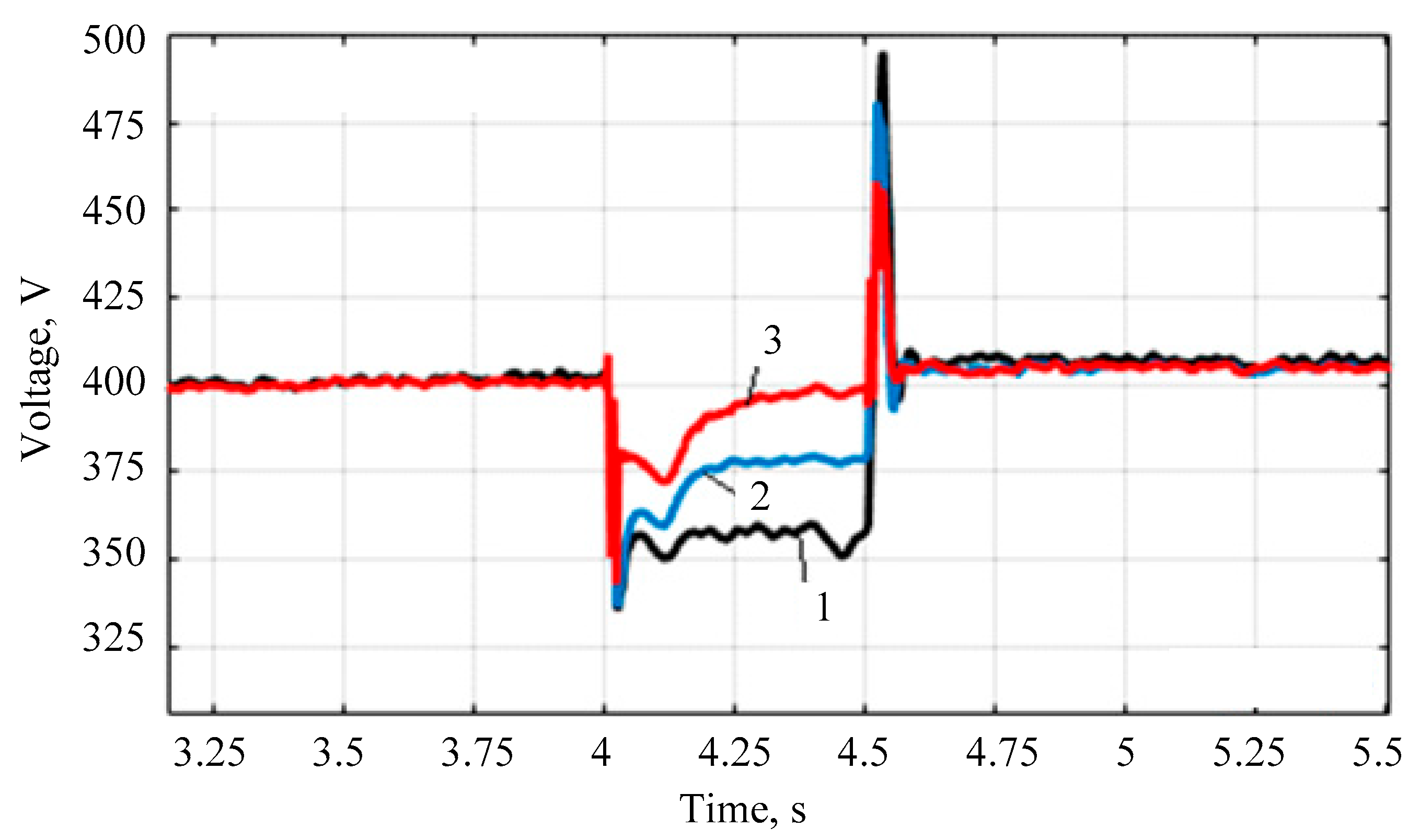 - The proposed regulator allows maintaining the voltage at the consumer near the nominal value when connecting an additional load. At the same time, voltage forcing and the energy storage device ensure a rapid increase in voltage to the nominal value.