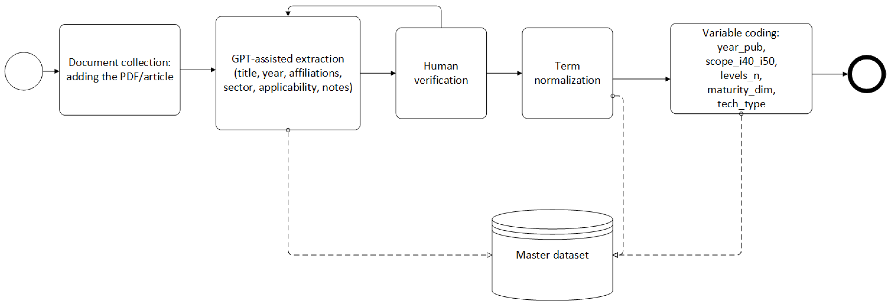 - Industry 5.0 (I5.0): Models that contain at least one dimension, subdimension or group of items that directly evaluates human-centricity (e.g., ergonomics, skills, participation, privacy/security by design), sustainability (environmental and/or social) and/or resilience (e.g., business continuity, flexibility, recovery capacity), and where these aspects are explicitly integrated into levels, indicators or weights.