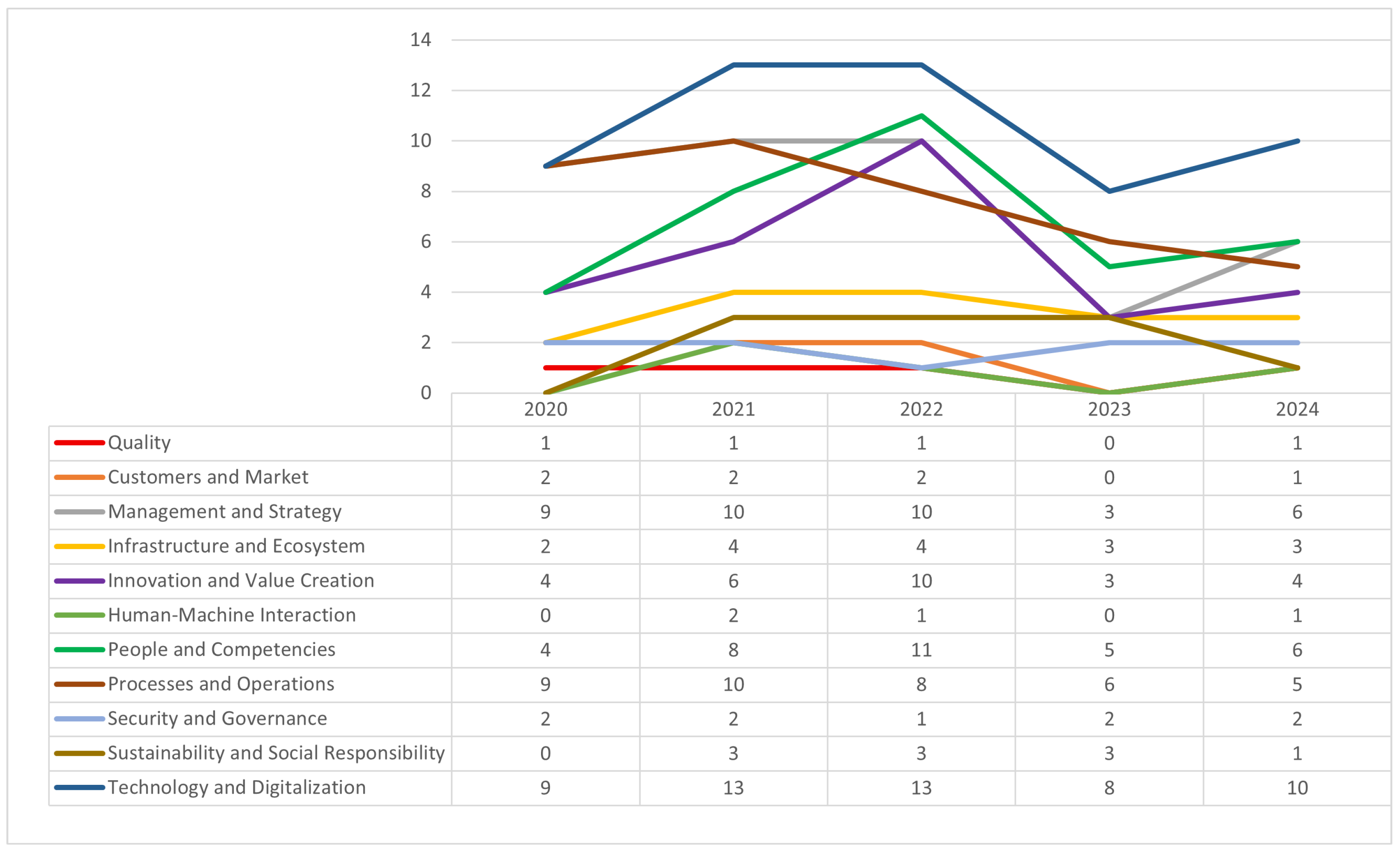 - Thematic classification: identification of broad categories (technology, processes, people, sustainability, etc.) as transversal axes. Terms such as “Technology”, “Digitalization”, and “IoT” were grouped under Technology and Digitalization.