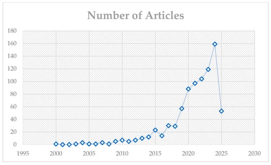 To provide a comprehensive overview of the dynamics in revisit intention research, this section first presents the annual development in the number of scholarly publications addressing the topic. The visualization of publication trends not only reflects the level of academic attention given to tourist loyalty issues but also highlights the topic’s relevance in addressing the evolving challenges and demands of the global tourism industry. Figure 1 illustrates the growth in the number of scientific articles examining revisit intention from 2000 to 2025, based on the data collected through the systematic review.
