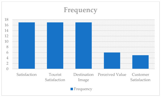 As shown in Figure 3, three antecedent variables, such as Satisfaction, Tourist Satisfaction, and Destination Image, appear most frequently, each cited in 17 articles. These results suggest that both general and tourism-specific satisfaction, along with perceptions of destination image, are consistently recognized as central drivers of tourists’ intention to revisit a destination. Perceived Value ranks next, identified in 6 studies, indicating that tourists’ assessment of received value relative to their expectations plays a meaningful, though less frequently explored, role. Finally, Customer Satisfaction is reported in 5 articles, pointing to a narrower yet significant dimension of how the fulfillment of customer expectations directly relates to revisit intention. Beyond these descriptive patterns, the dominance of satisfaction-related constructs and destination image reflects the strong alignment of revisit intention research with loyalty frameworks in consumer behavior theory. At the same time, the relatively limited attention to perceived value and customer satisfaction suggests that more nuanced aspects of tourist decision-making, such as cost–benefit evaluations and service-specific experiences, remain underexplored. Addressing these gaps may expand the theoretical landscape by integrating economic and experiential perspectives into models of revisit intention. Collectively, these findings underscore the critical influence of satisfaction and destination perception in shaping revisit behavior within tourism research.
