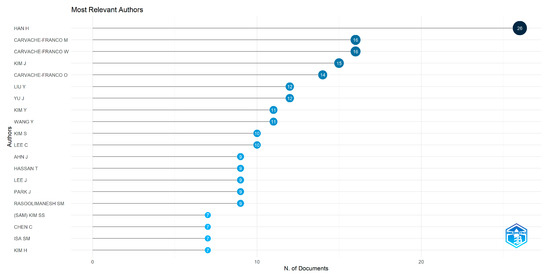 The bibliometric analysis of the most relevant authors is shown in Figure 4, which visualizes the researchers with the greatest contributions to studies on revisit intention. The figure presents the 20 most productive authors based on the number of publications and provides an overview of those who consistently contribute to this topic. This finding is important because it guides future researchers to refer to the key works that dominate the development of revisit intention research.
