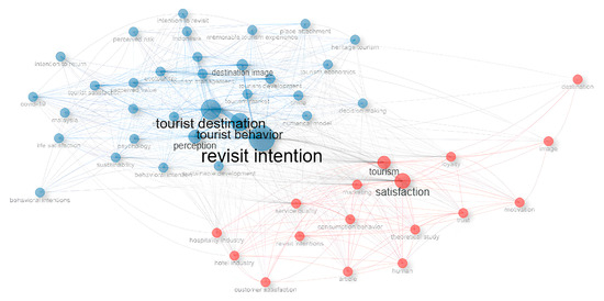 From Figure 5, it is clear that the keyword “revisit intention” is central and closely connected to concepts such as tourist destination, tourist behavior, destination image, and satisfaction. The blue cluster highlights a focus on tourist behavior, destination image, and travel experience, while the red cluster is more related to service quality, loyalty, and customer satisfaction. This pattern indicates that research on revisit intention is not limited to the behavioral dimension of tourists but is also enriched by managerial factors such as service quality and destination marketing strategies. Thus, the keyword network confirms that revisit intention is a multidimensional topic that develops at the intersection of tourist behavior, destination experience, and service satisfaction.