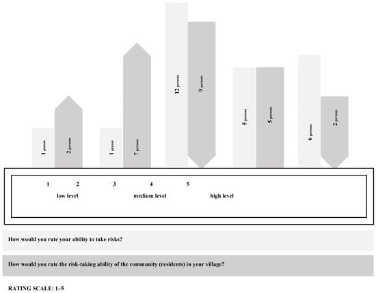 The research results presented in this section have been compiled in a descriptive form, enriched with diagrams illustrating scales and relationships, tables containing summary lists of factors and entities, and narrative interpretations. The results of the respondents’ self-assessment of their risk-taking ability reflect a distribution of responses that oscillates mainly around the medium and high levels. Nearly half of the study participants (12 people) declared a medium risk-taking ability. Another six people gave the highest rating. Only two of the respondents indicated a low level, giving a score of 1 or 2. A more diverse distribution of responses was obtained in the assessment of risk-taking ability in relation to the local community. In this case, a significantly smaller group of respondents (16 people) indicated a high or medium level. As many as 9 people rated the community’s risk-taking ability as low. The results of the self-assessment of risk-taking ability and the assessment from the perspective of the local community are presented in Figure 2.