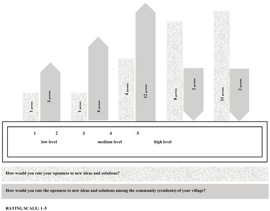 In the case of the trait: openness to new ideas and solutions, the majority of participants in this study were people who rated their openness highly (9 people). Only two respondents declared a low level of self-assessment of this trait. A different distribution of responses was obtained when assessing this trait from the perspective of the local community. In this case, the assessments mostly oscillated around the average and low levels. Such a declaration was made by 12 and 9 people, respectively. Only 2 respondents rated the openness of the local community highest. The results of the self-assessment of openness to new ideas and solutions, together with the assessment from the perspective of the local community, are presented in Figure 3.