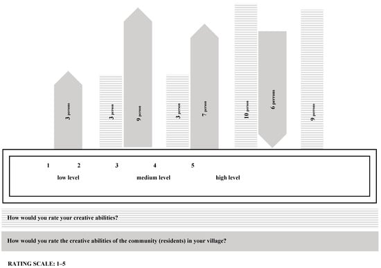 Responses regarding self-assessment of creative abilities indicate a high level of this trait among the vast majority of respondents (19 people). However, this does not translate into an assessment of abilities from the perspective of the local community. In this case, only six respondents gave a rating of 4. When assessing this trait, no one declared the lowest level. Meanwhile, twelve respondents believe that the creativity of the local community is low. None of the participants indicated the highest level. The results of the self-assessment of creative abilities and the assessment from the perspective of the local community are presented in Figure 4.