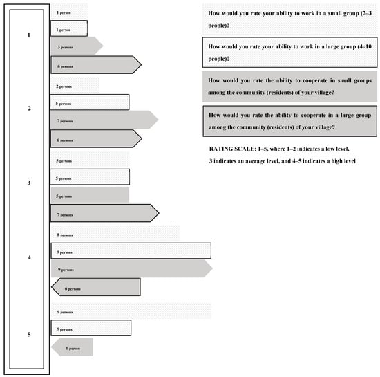 Seventeen respondents declared a high ability to cooperate in a small group of 2–3 people. The self-assessment results mostly indicate an average and high level. Nine, eight, and five respondents rated this trait in the range of 5 to 3 (5, 4, and 3, respectively). A slightly lower level of self-assessment was obtained when examining cooperation in larger teams of 4–10 people. In this case, 14 people rated this trait highly. A significantly different distribution of responses was obtained when assessing the residents’ ability to cooperate. Only ten respondents rated cooperation in small groups highly. According to the next ten, the ability to cooperate at the local community level is low. The same applies to cooperation in large teams. In this case, none of the respondents gave the highest rating. The results of self-assessment of the ability to cooperate and assessment from the perspective of the local community are presented in Figure 5.