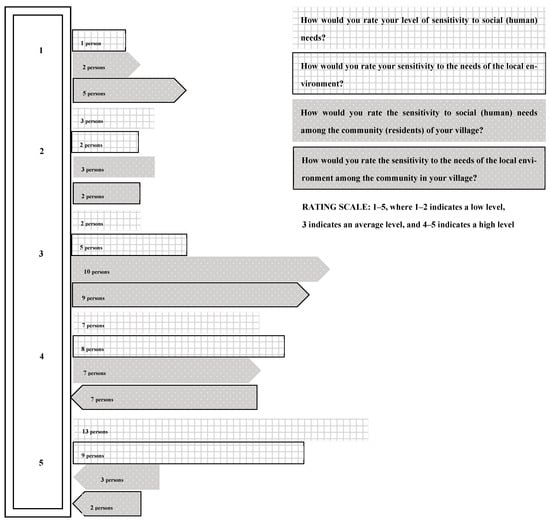 When analyzing self-assessment of sensitivity to social (human) needs, the vast majority of respondents (20 people) indicated a high level. More than half of the respondents rated this trait highest. Only three of the 25 participants in this study had a low level of sensitivity. Similar self-assessment results were obtained in the study of sensitivity to the needs of the local environment, including nature conservation, shared infrastructure, etc. The vast majority of respondents declared a high level of this trait. Only three people had a low level. A slightly lower level of sensitivity to social and local environmental needs was attributed to residents. However, according to the respondents, medium and high ratings still prevail. The results of the self-assessment of sensitivity to social and local environmental needs and the assessment from the perspective of the local community are presented in Figure 6.