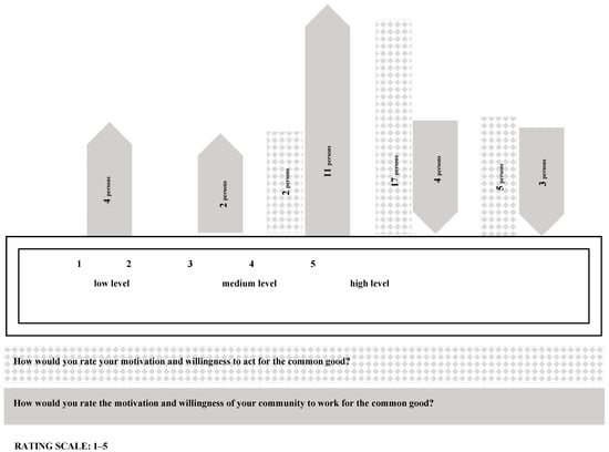 Among the respondents, a high level of self-assessment was achieved in the area of motivation and willingness to act for the common good, as confirmed by the responses of twenty-three people. The remaining two rated the trait at an average level. A different distribution of responses using the full rating scale (i.e., from 1 to 5) was obtained for the assessment of motivation and willingness to act for the common good from the perspective of the community of residents. In this case, only seven respondents rated this trait highly. The remaining eleven indicated an average level. The results of the self-assessment of motivation and willingness to act for the common good and the assessment from the perspective of the local community are presented in Figure 7.