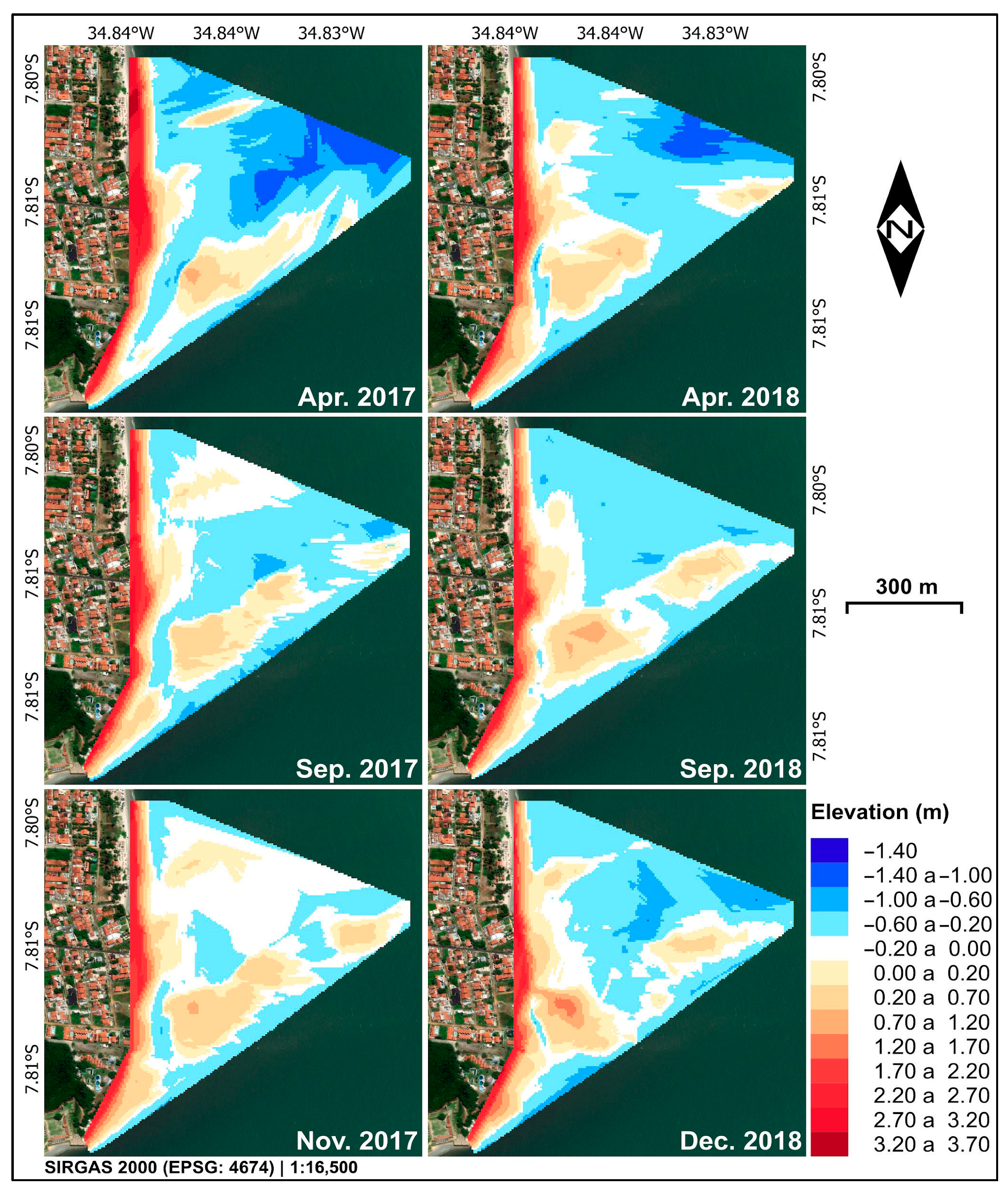 | April 2018 | 2.90 m/−1.40 m | Persistent NE-E depression; central sandbanks nearly merged (continued offshore sediment storage). |