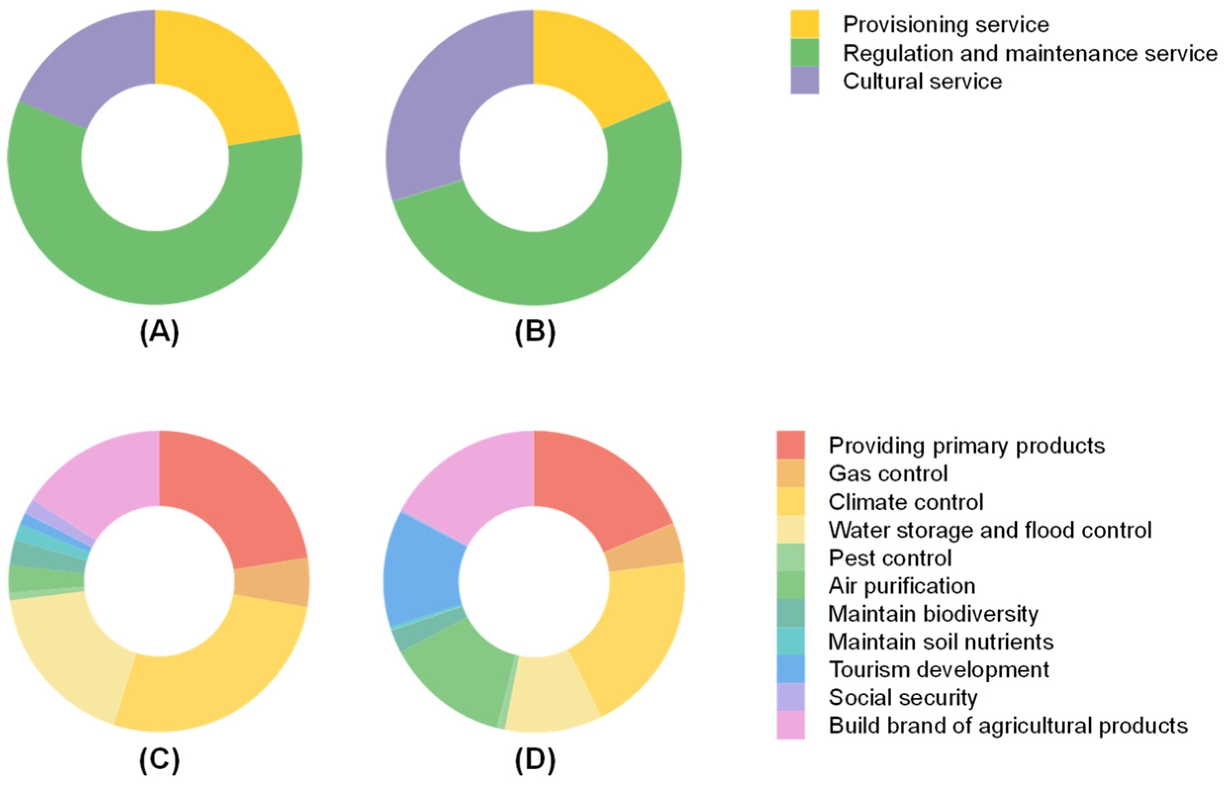 - Enhance Land Use Efficiency: Leverage extensive farmland by optimizing rice–crayfish rotation systems, and integrate high-value crops such as lotus root and water bamboo. This strategy directly enhances provisioning service value (from 77,762.06 CNY/ha) by diversifying agricultural outputs and increasing economic returns. Moreover, by promoting integrated crop management, it can reduce reliance on external pesticides and fertilizers, thereby improving the pest control service (valued at 3021.45 CNY/ha) and mitigating potential water pollution.