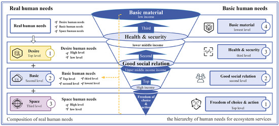 Based on Maslow’s hierarchy of needs and the Millennium Ecosystem Assessment (MA) definition of human well-being, a four-level framework for human basic needs for ES was established [22]: basic material needs, safety and health, good social relationships, and freedom of choice and action. Subsequently, relative weights were assigned to each level according to World Bank classifications. These weights were then combined with urban–rural population differences to calculate weighted values, resulting in the basic needs level for each region [23].