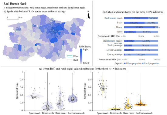 Contrasting RHN in urban and rural areas. (a) Spatial distribution of RHN across urban and rural settings; (b) Urban and rural shares for the three RHN indicators (basic, desire, space); (c) Urban and rural value distributions for the three RHN indicators (basic, desire, space).