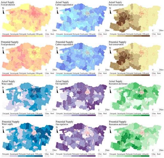 The spatial distributions of potential supply and actual supply for food production, water supply, gas regulation, and recreation and leisure services show significant differences between urban and rural areas (Figure 5). In terms of potential supply, rural areas exhibit higher potential supply for food production, water supply, gas regulation, and recreation and leisure compared to urban areas, overall displaying a decreasing trend from west to east. For actual supply, high-value areas are gradually shifting towards central urban regions. Specifically, the actual supply of food production services in urban areas is higher than in rural areas. In terms of realized services, food production shows higher actual supply levels in urban units than in rural ones. By contrast, rural units provide more water supply than urban units, with the strongest values occurring in the western part of the study area. Areas with high gas-regulation supply are concentrated in the central urban core and in several rural townships to the south, southwest and northwest. Actual recreation and leisure supply is mainly contributed by a limited number of central urban units and by rural areas located in the south, southwest and southeast.