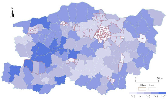 First, the standardized indicator values are weighted and summed according to their entropy weights to obtain the initial RHN index for each basic spatial unit. Then, to reflect the macro-level influence of urban–rural population differences on total demand, the urban and rural areas are treated as two aggregates. The total initial RHN values of urban and rural units are adjusted again using the proportions of permanent urban and rural populations as weights, so that the total RHN of the whole city is consistent with the urban–rural population distribution.
