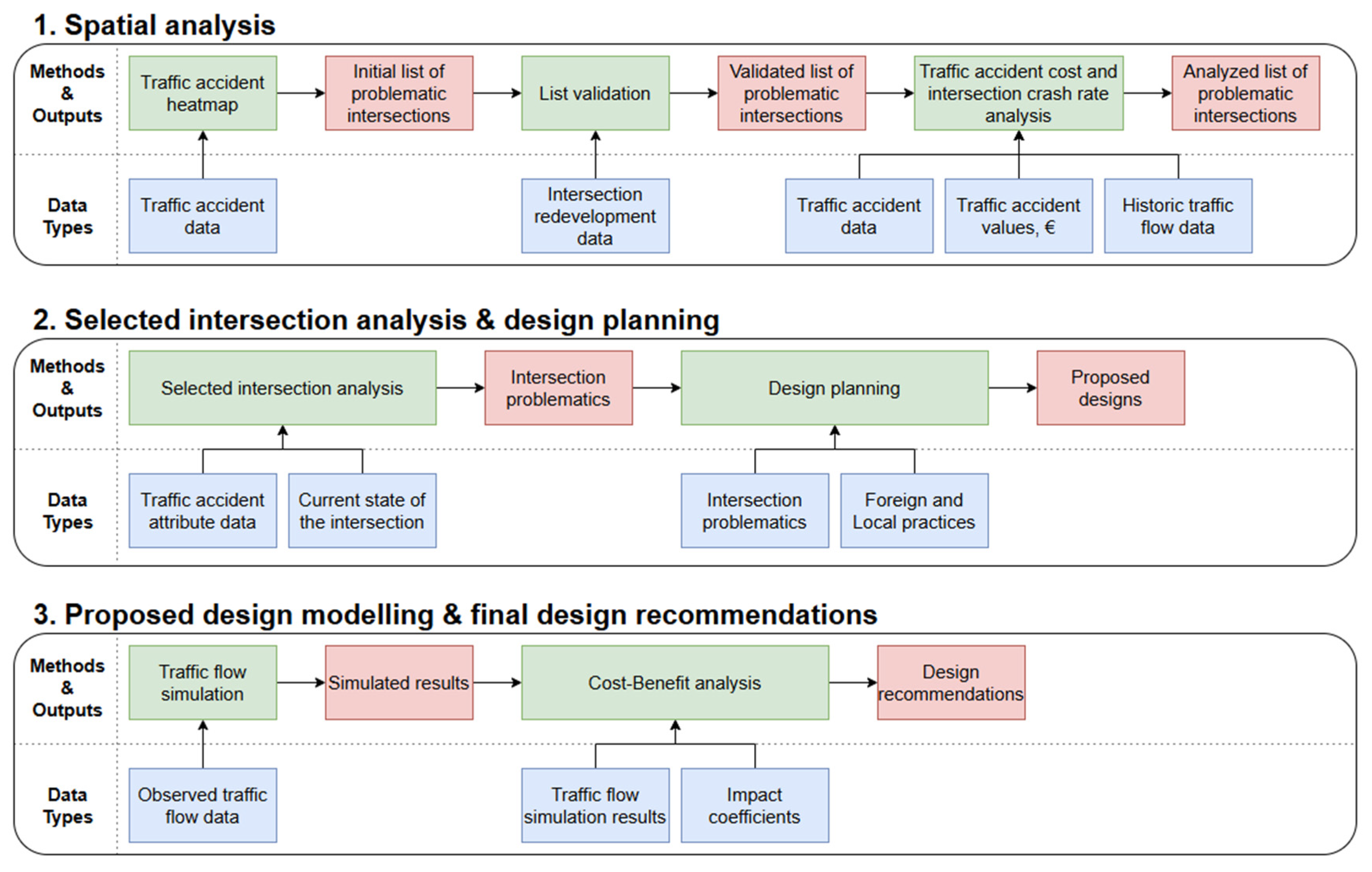 This study contributes to the field by integrating macro-level spatial analysis with micro-level intersection modelling within an end-to-end framework. The proposed methodology combines KDE-based hotspot detection and intersection crash rate calculations with calibrated FCD exposure data. The selected intersection in Vilnius is analyzed using drone-based traffic observation and conflict metrics. Design alternatives are proposed and modelled using PTV Vissim to evaluate their impact on traffic flow and safety.