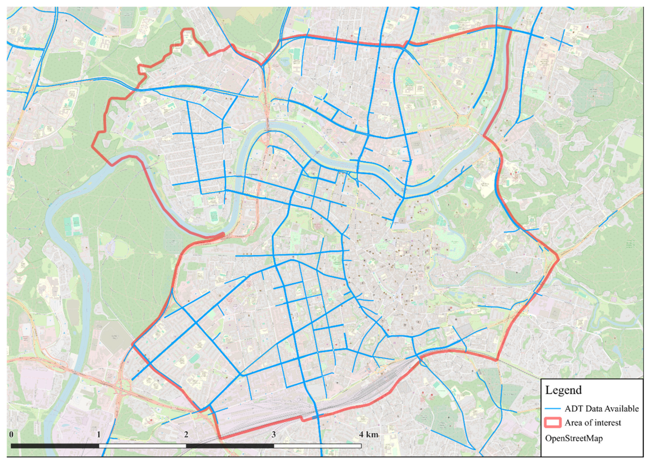 Figure 3 below demonstrates that the traffic flow data are only available for a portion of the road network inside the area of interest, excluding most streets without traffic lights or those with lower traffic volumes/road category. Therefore, to overcome the data gap, an alternative traffic flow data source, Floating Car Data (FCD), was chosen. In addition, based on the seasonality of Vilnius city, which indicates that the lowest traffic flows are recorded in January and August, while the highest traffic flows are observed in May and September, it was decided to use the average daily traffic of May for the calculation of intersection crash rates [