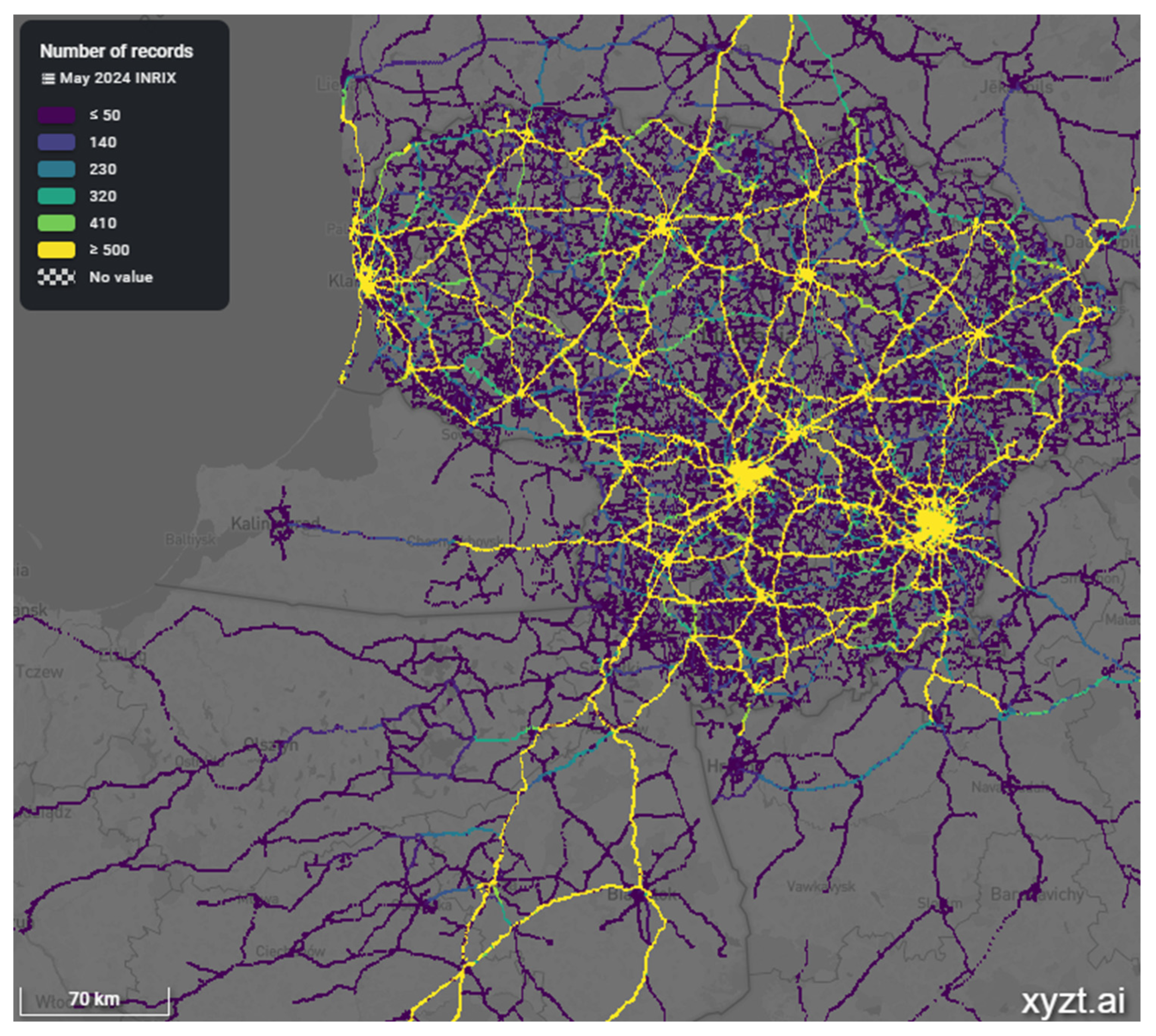Figure 4 below visualizes the trips observed by INRIX in May 2024 using the XYZT.ai visual analytics platform. Roughly 2.2 million trips had been recorded by INRIX that either went through, out of, into or started and ended inside Lithuania’s territory. The average travel time of one trip at the national level was around 1 h and 35 min, and the average observed speed was 72.6 km/h.