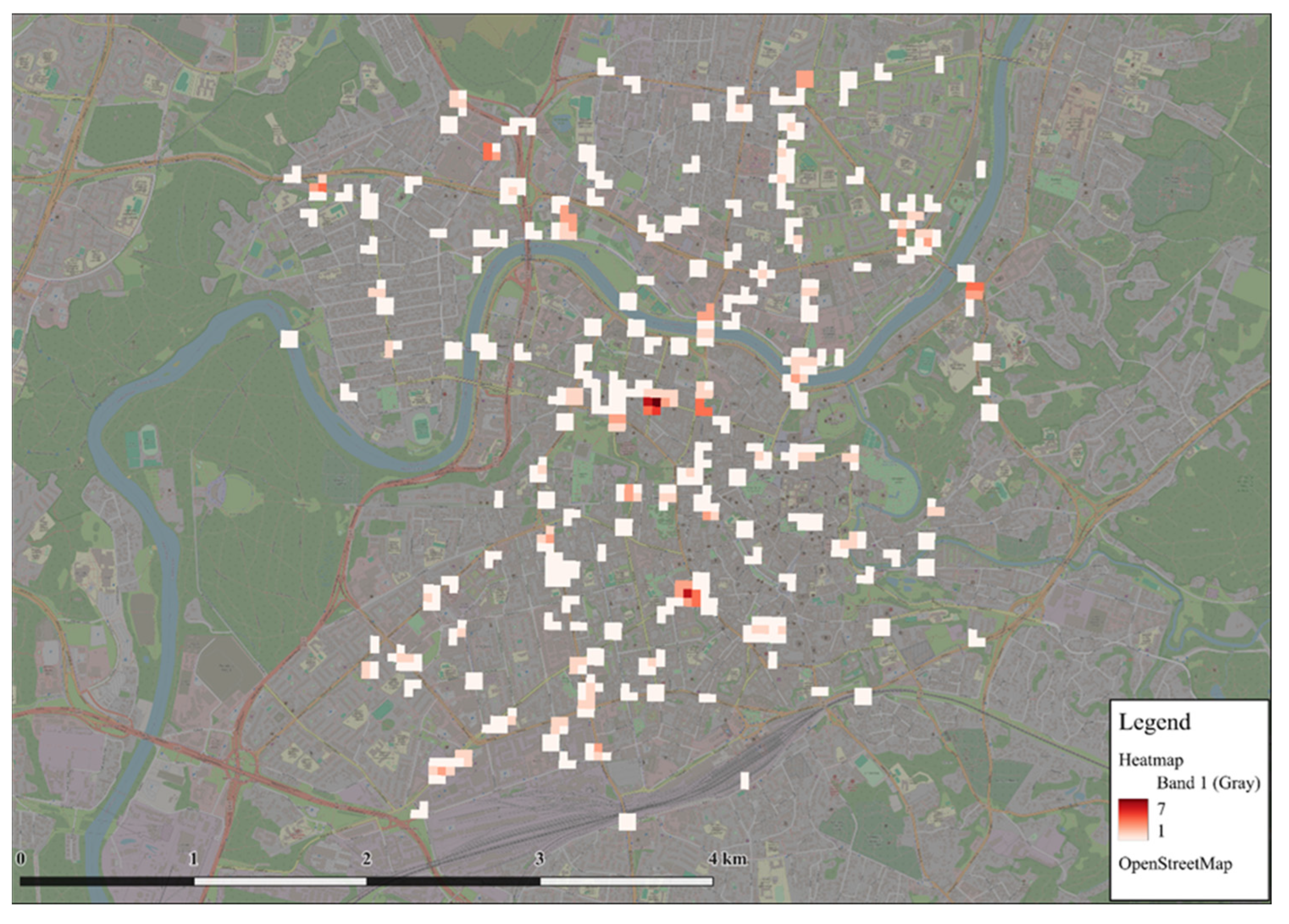 The obtained traffic accident data are available in JSON format, which includes only records classified as accidents with bicycles, effectively capturing all micromobility-related accidents. The filtered data are converted to a CSV file and imported into QGIS Desktop 3.34.3 software for further spatial analysis. Using embedded geographic coordinates for each traffic accident (latitude and longitude) under the EPSG:3346—LKS94 / Lithuania TM projection, the data are mapped as point layers. These are merged and spatially filtered using QGIS’s Merge and Intersect functions to isolate accidents that occur within the selected area, resulting in a final dataset ready for further examination. To continue the spatial analysis, the prepared traffic accident point layer is used to generate a traffic accident density, or heatmap. It allows for the identification of areas with a higher concentration of traffic accidents compared to other parts of the study area. To produce the heatmap, the study employed the Styled Heatmap (Kernel Density Estimation) feature from the QGIS Density Analysis Plugin [