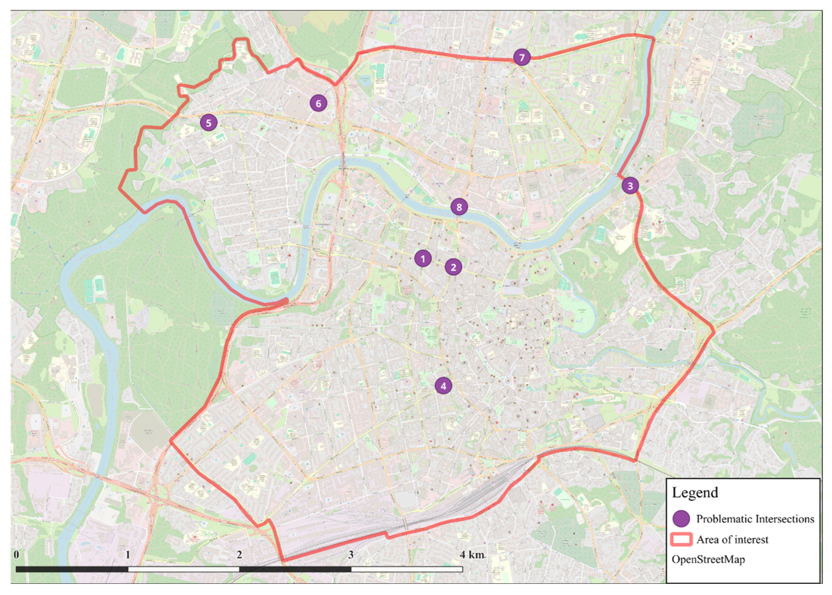 The proposed methodology was applied to a selected area of interest located in Central Vilnius, Lithuania. It helped to identify 8 problematic intersections within the selected data range and criteria.