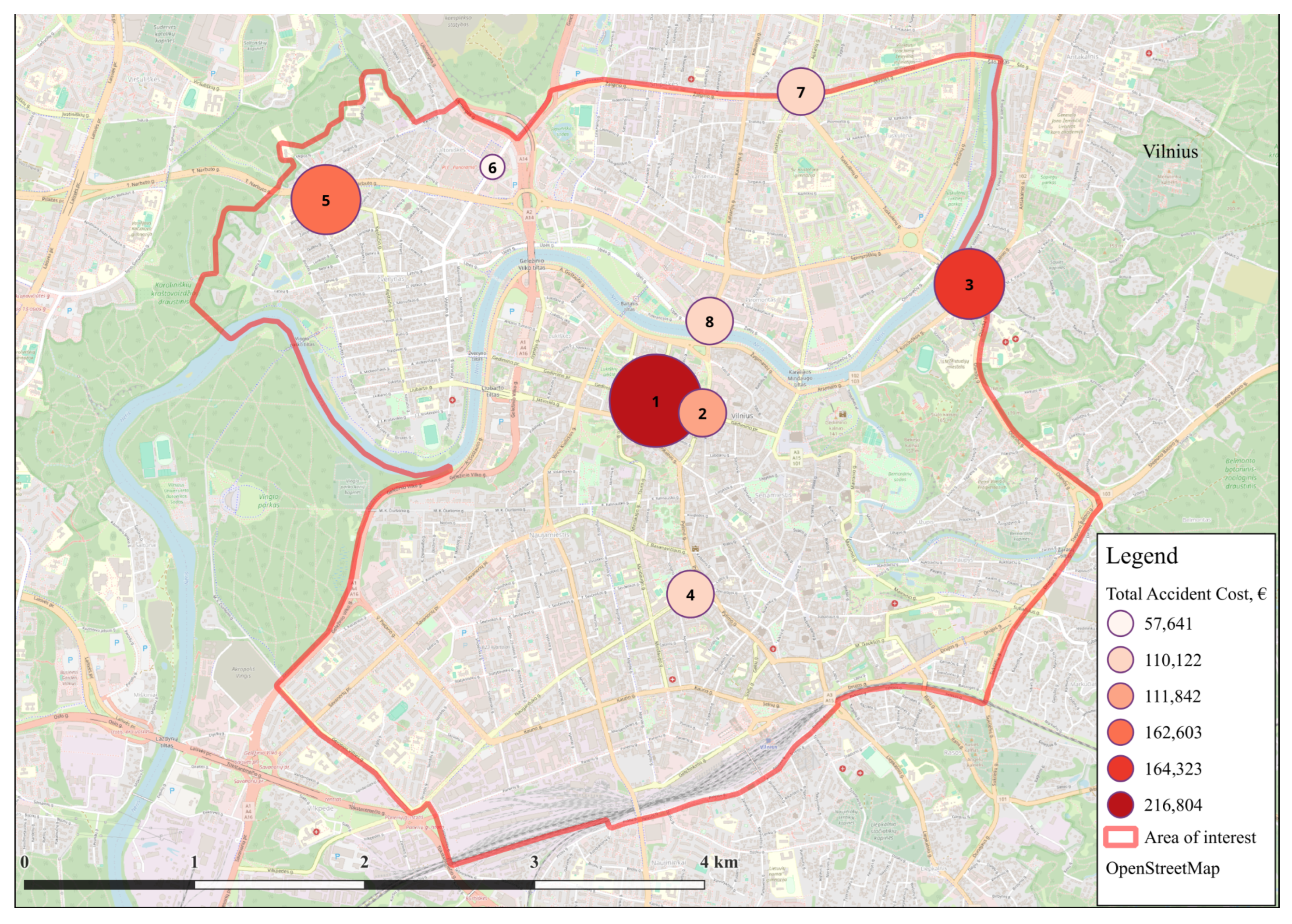 To summarize, the spatial analysis revealed 8 problematic intersections. Three of them recorded 4 traffic accidents each, while the remaining five recorded three accidents each. Further analysis of the eight problematic intersections showed that in terms of traffic accident costs, the most problematic intersection was number 1, between Gedimino Avenue, A. Jakšto and A. Stulginskio Streets, with the corresponding total cost of €333,878.2. Meanwhile, the intersection crash rate analysis showed that the most accident-prone intersection was number 2, between Gedimino Avenue, Vilniaus, and Jogailos Streets, with a crash rate of 0.151.