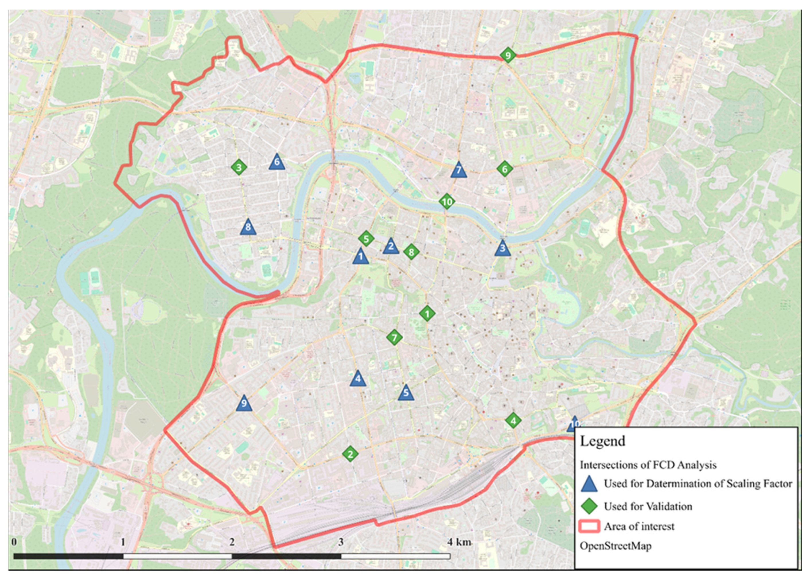 Scaling of Floating Car Data (FCD). While for the Vilnius case study, the R-squared value was 0.87, indicating that 87% of the scaled FCD values represent the actual observed traffic flows from JUDU sensor data, the scaling factor could be further calibrated by enhancing the current linear approach. Future work could begin with an uncertainty analysis of the JUDU sensor data to identify possible deviations between sensor measurements and actual field-observed flows. Furthermore, the scaling factor might be made conditional on variables such as road type, intersection type, surrounding land use, and other relevant metrics. This calibration could be achieved by identifying the uncertainty of INRIX FCD compared with field-validated traffic flows across selected road sections and locations.