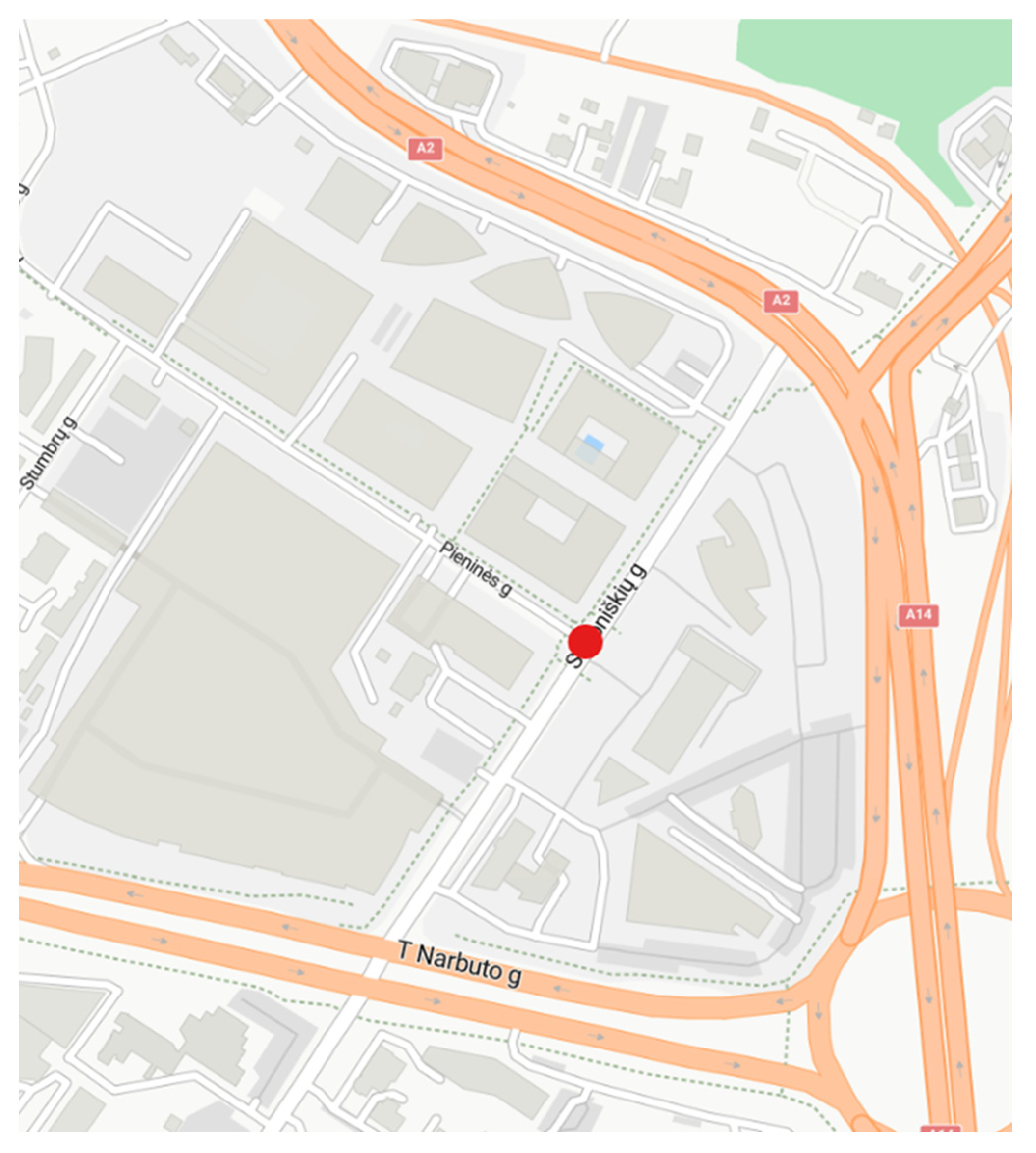 The selected intersection is in the Žirmūnai district, northwest of the study area. It is set in a mixed-use urban environment of leisure, office, and other institutional buildings. It also serves as a bypass road between two important Vilnius arteries—Ukmergės Street (A2 highway) and T. Narbuto Street (see