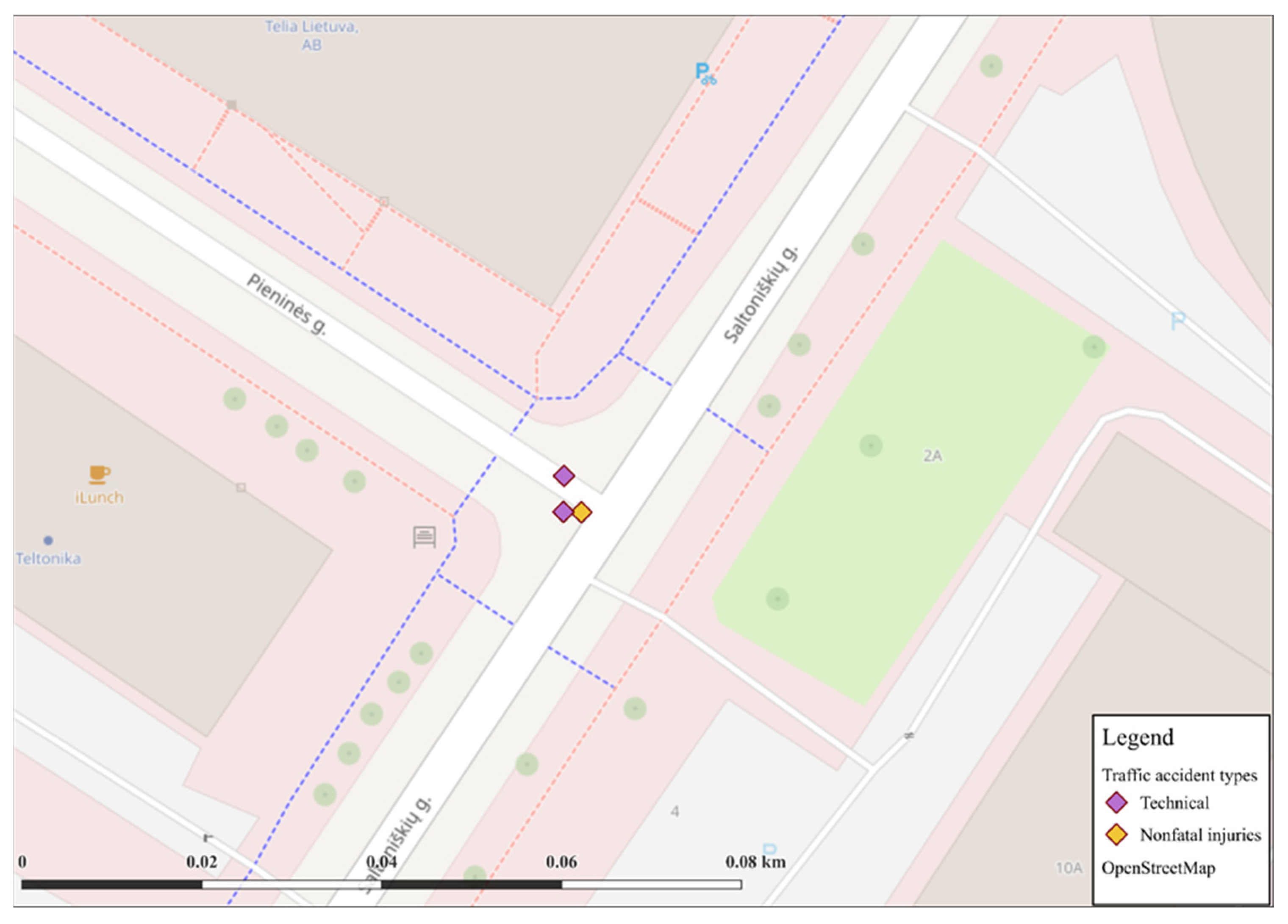 Figure 12 below). Two traffic accidents were of the technical type, and one resulted in non-fatal injury. Based on the locations of the data points and their associated attributes, all three accidents can be identified as having occurred on the crosswalk/bicycle crossing between Pieninės and Saltoniškių streets. This is likely due to the fact that the main micromobility traffic flows through that crossing, where the two-way bicycle path on that side of Saltoniškių Street intersects with the two-way bicycle path on the right side of Pieninės Street.