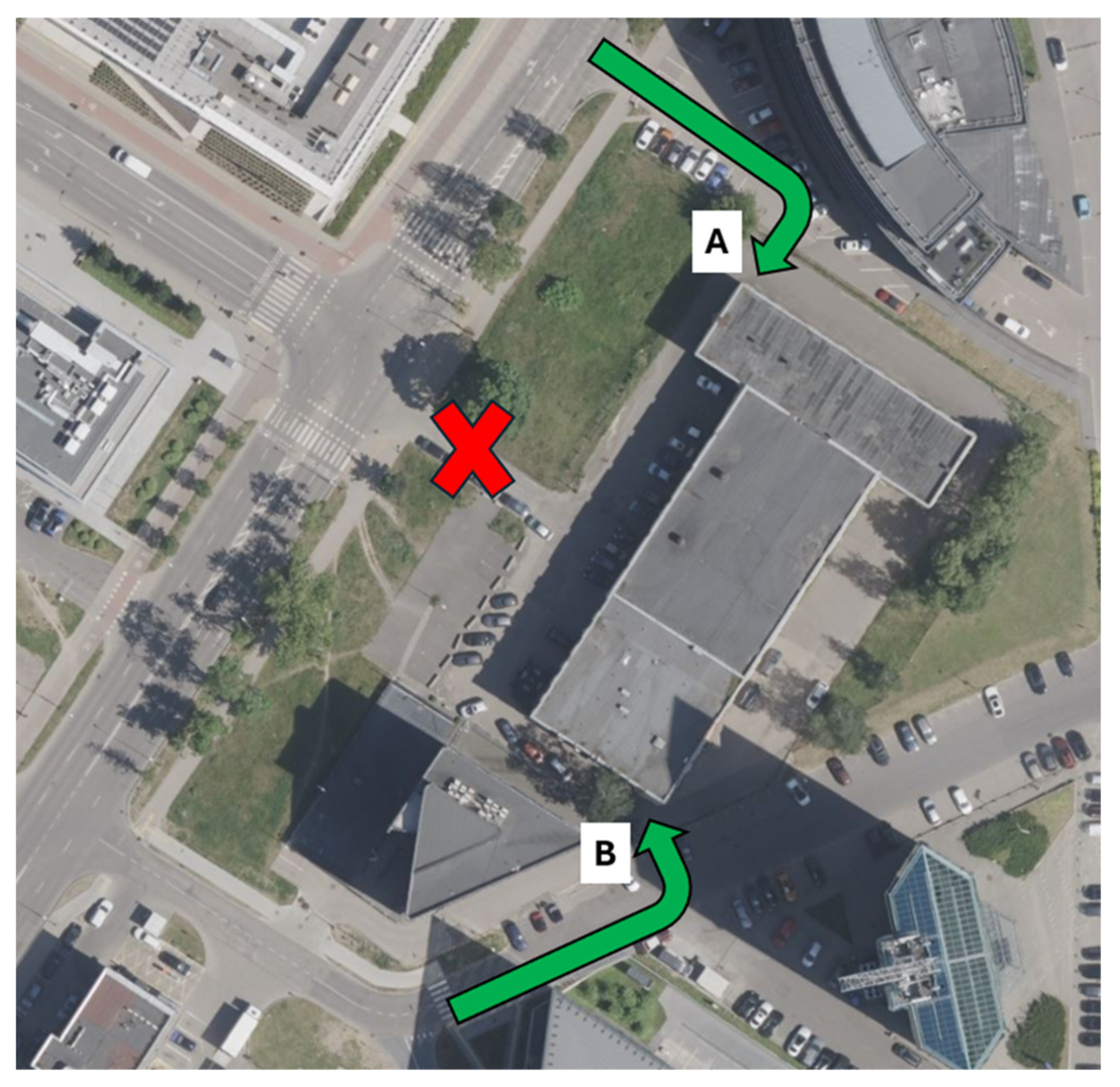 31] indicated that the accident occurred when a vehicle turned right and the pedestrian was already on the crosswalk. Since it was unclear how far into the street the pedestrian had already entered, it was feasible that the accident occurred right after the first step. There are only two possible right turns intersecting crosswalks at Saltoniškių Street: towards Pieninės Street and into the driveway. Regarding the right turn towards Pieninės Street, no potential obstacles are blocking the view for vehicles. However, for right-turn movements into the driveway, a tree located approximately 10 m before the midpoint of the crosswalk may partially obstruct drivers’ visibility. Nonetheless, this traffic accident stresses the necessity to minimize or potentially eliminate the point of conflict between vehicles turning right and pedestrians/micromobility users using the crosswalk.