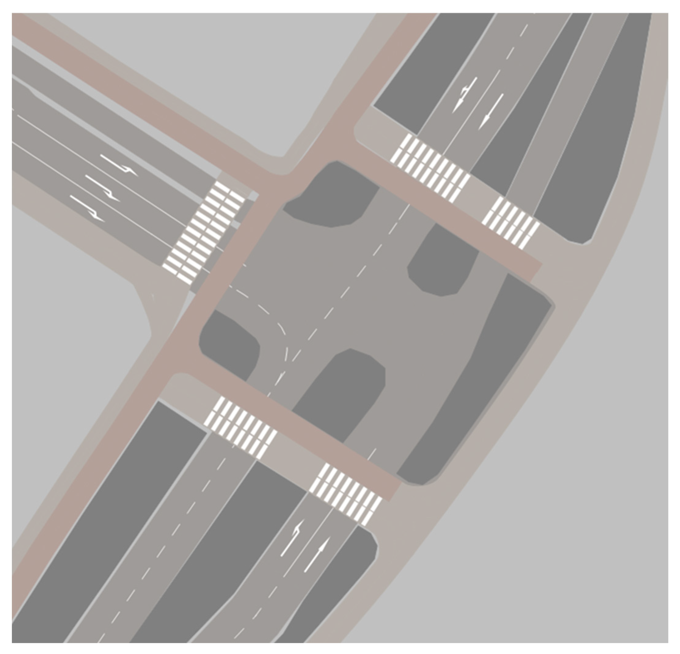 Figure 16. Apart from the removed driveway, the main geometry of the intersection remains unchanged, but a traffic light is introduced to regulate traffic flows.