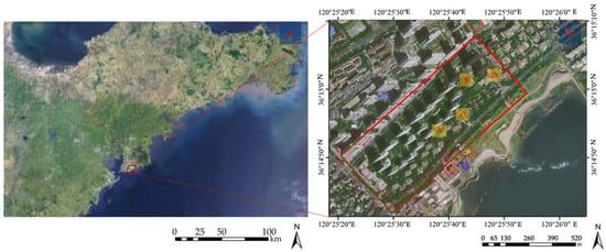Qingdao is a coastal city in eastern China, with longitude 119°30′–121° E and latitude 35°35′–37°09′ N (Figure 1). The average maximum temperature in the urban area during summer is between 23.0 and 32.0 °C, and the average minimum temperature during winter is between −7.0 and 1.0 °C [24]. A southeast wind prevails in summer, and a northwest wind prevails in winter. The average wind speed in urban areas along the southeast coast ranges from 3.4 to 5.4 m/s in summer [25]. The study area is situated in a representative urban zone, bordered by the sea to the southeast and characterized by a general slope gradient of 3–7%. The site is occupied by high-density residential buildings of varying heights (12–140 m), while the green infrastructure coverage within the area is about 40%. The research was conducted in a locally typical coastal sloped area, defined as a high-density built-up environment, serving as a representative case for the thermal conditions. The selection of the measurement points should fully consider the diversity of building types and vegetation coverage in the survey site. Finally, four typical locations of a forested area between multi-story buildings, a forested area between high-rise buildings, an unshaded area between multi-story buildings, and an unshaded area between high-rise buildings were determined to accurately analyze the specific impact of the difference between building and vegetation coverage on the microenvironment.