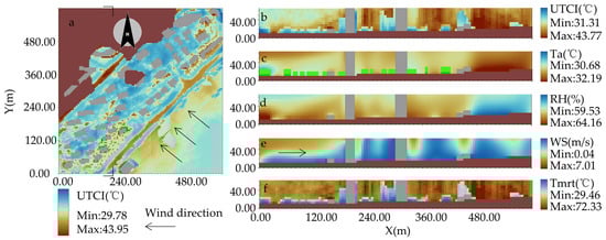 (a) UTCI distribution of the current scene at pedestrian height; (b) UTCI distribution at the cutting position; (c) Ta distribution at the cutting position; (d) RH distribution at the cutting position; (e) WS distribution at the cutting position; (f) Tmrt distribution at the cutting position.