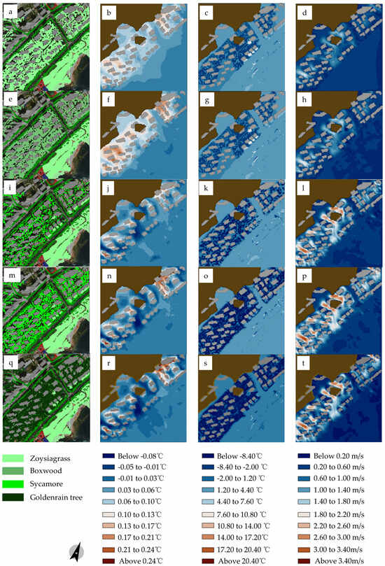 (a) Lawn scenario; (b) Ta difference distribution between the current scenario (CS) and the lawn scenario; (c) Tmrt difference distribution between CS and the lawn scenario; (d) WS difference distribution between CS and the lawn scenario; (e) shrub scenario; (f) Ta difference distribution between CS and the shrub scenario; (g) Tmrt difference distribution between CS and the shrub scenario; (h) WS difference distribution between CS and the shrub scenario; (i) Low tree coverage (LTC) scenario; (j) Ta difference distribution between CS and LTC; (k) Tmrt difference distribution between CS and LTC; (l) WS difference distribution between CS and LTC; (m) High tree coverage with low LAI (HTC-1) scenario; (n) Ta difference distribution between CS and HTC-1; (o) Tmrt difference distribution between CS and HTC-1; (p) WS difference distribution between CS and HTC-1; (q) high tree coverage with high LAI (HTC-2) scenario; (r) Ta difference distribution between CS and HTC-2; (s) Tmrt difference distribution between CS and HTC-2; (t) WS difference distribution between CS and HTC-2.