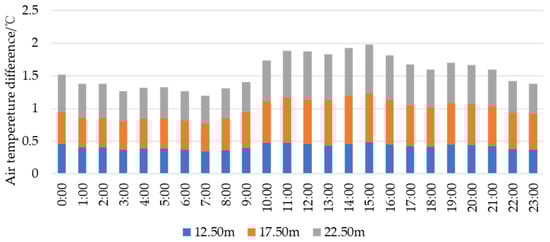 The thermal environment differences between the optimization strategy and the current state of the study area were analyzed to evaluate the Ta differences between the proposed and existing conditions. Due to the influence of elevation and the ocean, the average Ta differences at three height planes—12.50 m, 17.50 m, and 22.50 m (which also represent pedestrian-level heights under topographic influence)—were accumulated to analyze the optimized cooling effect. The optimization simulation exhibited a cooling effect throughout the day, with the most significant reduction observed at 15:00. The maximum temperature decreases across the three heights were 0.49 °C, 0.74 °C, and 0.75 °C, respectively (Figure 6). By accumulating the hourly average Ta drop of each altitude layer throughout the day, the daily cumulative Ta drop was calculated to be 12.48 °C. This significant cooling rate indicated considerable carbon emission reduction and energy saving benefits. Among the three investigated heights, the most pronounced cooling effect was observed at 17.50 m, followed by 22.50 m, with the 12.50 m level showing the least reduction. Given that the 17.50 m height level featured the highest building density and the greatest variation in building heights, it could be inferred that the optimization greening strategy has a significant cooling effect in high-density built-up areas on coastal slopes.