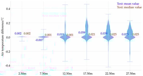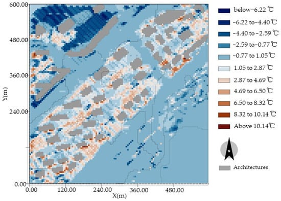 Following the implementation of the optimal greening strategy, an analysis of the thermal environment at six height levels (2.50 m to 27.50 m) at 15:00 in summer was conducted. The results showed that the average Ta and UTCI could be reduced by 0.034 °C and 0.245 °C, respectively, with maximum reductions of 0.462 °C and 11.069 °C (Figure 7). Among all height levels, a slight cooling effect was observed at 2.50 m. In contrast, the 7.50 m layer was the only one that exhibited a warming trend, with an average Ta change of −0.007 °C. The 17.50 m layer exhibited the most pronounced cooling trend, with a mean value of 0.059 °C and a median of 0.021 °C. A significant portion of the area experienced cooling effects, with 43.93% of the region showing statistically significant cooling and 32.19% exhibiting strong cooling, indicating that the majority of the total area demonstrated some level of temperature reduction. Cooling was primarily observed in building-dense areas, particularly to the south of the buildings (Figure 8). The mean temperature reductions at the 22.50 m and 27.50 m heights were 0.038 °C and 0.025 °C, respectively, with cooling proportions of approximately 60–62%. However, the spatial distribution of the cooling intensity differed significantly between these two levels.