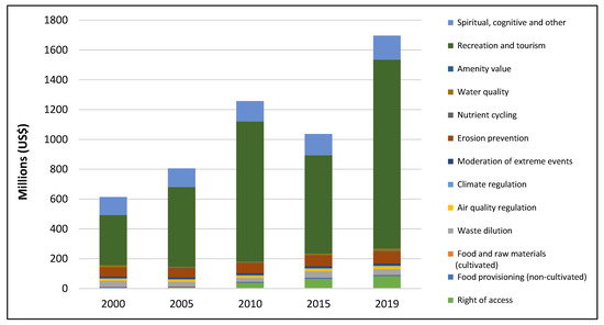 Cultural services were the most valuable of the four major types of ES, accounting for approximately three quarters of the value over the past two decades. Recreation and tourism contributed the highest value among the 15 ES, followed by another cultural ecosystem service in the form of spiritual, cognitive and other (Figure 2). Recreation and tourism explain between 54% and 75% of the value for local beneficiaries and between 50% and 71% for global beneficiaries of the value over the past two decades (see Appendix B and especially Figure A1, Figure A2, Figure A3, Figure A4, Figure A5, Figure A6, Figure A7, Figure A8, Figure A9 and Figure A10).