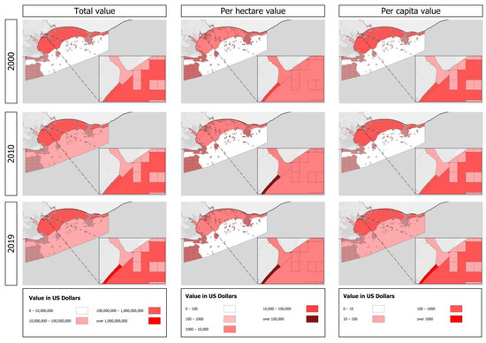 Spatial distribution of valuation results of Algoa Bay’s ecosystem services: 2000–2019. Ecosystem delineations are provided in Figure 1.