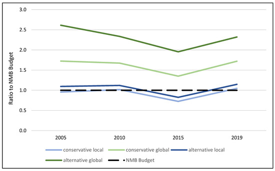 Four scenarios are being presented. They are for local and global beneficiaries, and for each of these two beneficiary groups a conservative and an alternative scenario were estimated. In each ES valuation, the smaller local population forms part of the global beneficiary group; however, some ecosystem services are only derived by the global level and not at the local level. While each of the beneficiary groups proved instrumental within the study, the local NMB residents are of particular importance on account of both the MSP orientation as well as the fact that benefits realised within such a group has direct implications for benefits realised among both the national and international groups. The conservative and the alternative scenarios for these two beneficiary groups refer to different sets of published unit ES values that were available from different sources. These scenarios are therefore not upper and lower scenarios from a single set of unit values, but rather different unit values from different sources, with the conservative scenario using the lowest available value each time.
